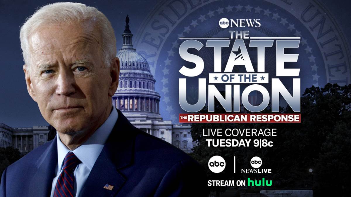 - ABC News presents special coverage of the 2022 State of the Union Address by President Joe Biden and the Republican response by Iowa Gov. Kim Reynolds. Primetime coverage will air on Tuesday, March 1, from 9:00 p.m. to 11:00 p.m. EST on ABC.