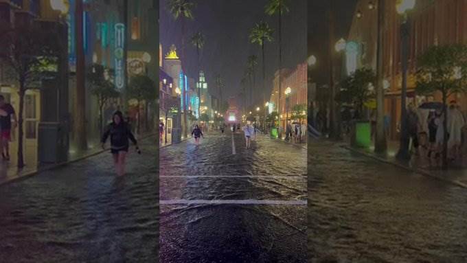 - In the video, we look down a flooded Hollywood Boulevard at the park, with water ankle to shin deep as guests exit the park. Some guests even take the opportunity to splash around and have fun.