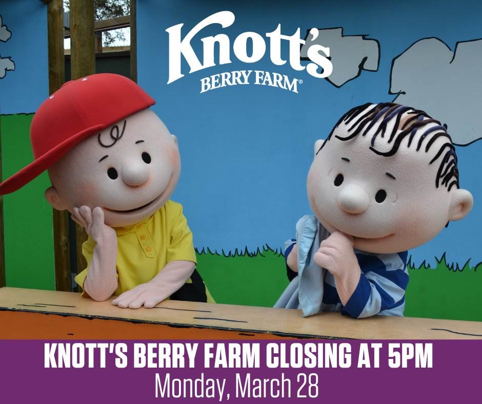 - Knott’s Berry Farm and Six Flags Magic Mountain announced via their Twitter accounts that they will be closing early or closed today, March 28th, due to inclement weather.