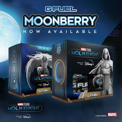 - In celebration of Marvel Studios' Moon Knight, an original series now streaming exclusively on Disney+, G FUEL — The Official Energy Drink of Esports — today announced its new caffeine-free Moonberry Hydration Formula is available as a limited-edition Collector's Box at GFUEL.com for U.S. fans while supplies last.