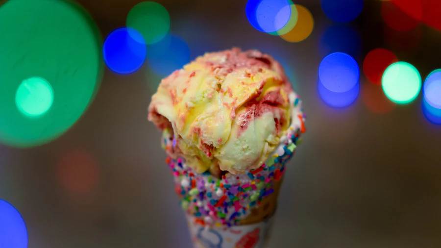 - Uni-cone: Banana, cherry, and pistachio ice cream in a white chocolate-dipped waffle cone with fantasy sprinkles.