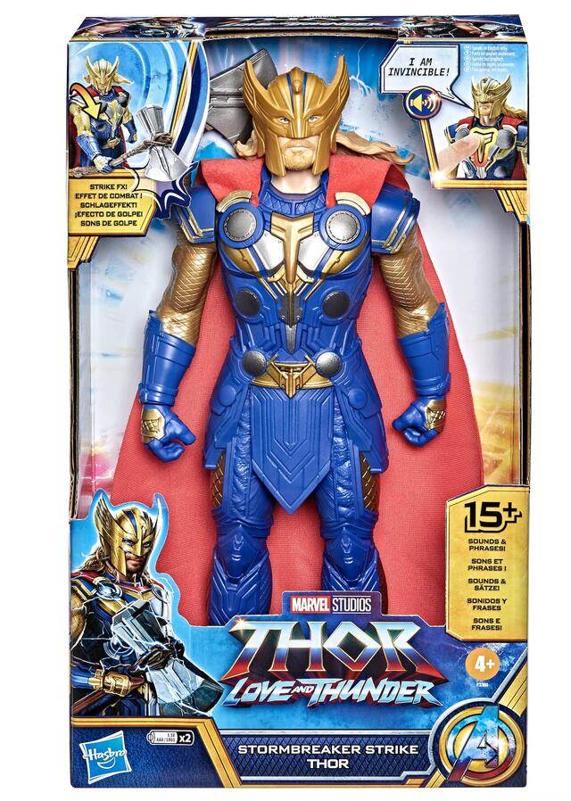 Thor’s powers and mighty voice are on display as part of the Stormbreaker Strike toy that showcases our hero in full armor, rocking a new helmet and cape.