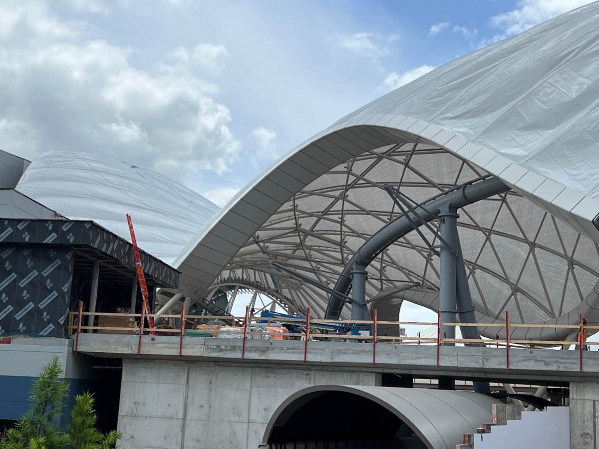 Construction appears to be mostly complete on the canopy over the exterior portion of the track, utilizing a special plastic polymer that is filled with air.