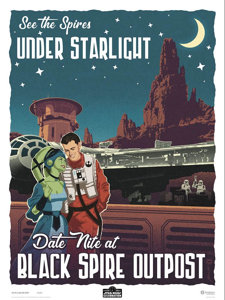 - “I was inspired to create a vintage-style illustration celebrating the thrill and romance of Black Spire Outpost under starlight. Imagine walking arm-in-arm with your date from a galaxy far, far away. The soft warm glow of lights and melodic sounds spill out of the cantina as exotic scents fill the nite air. You stroll past the Millennium Falcon and wonder what life as a smuggler would be like. Enjoy the perfect date nite on Batuu — just watch out for First Order stormtroopers!”