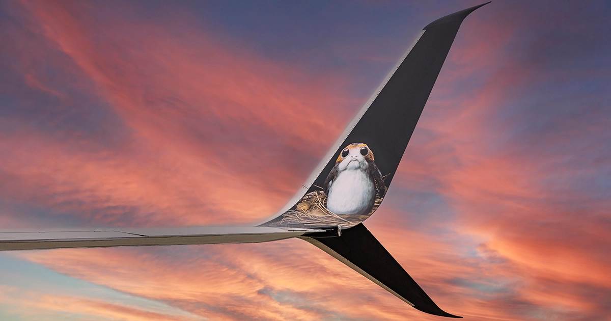 - The plane is painted space black and features the Millennium Falcon, TIE fighters, and even a Porg.