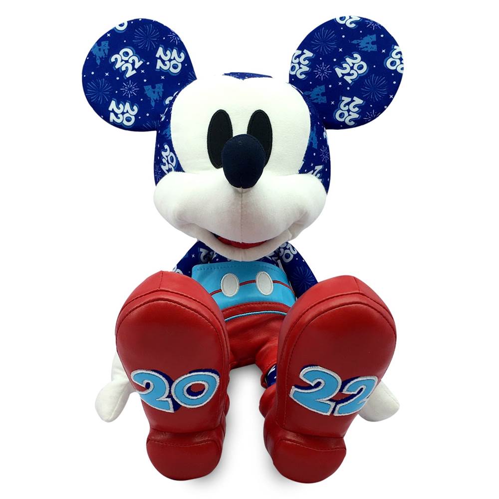 Our soft plush souvenir Mickey is covered in the spirit of celebration as he displays a burst of 2022 logos and fireworks from the Disney Parks, plus simulated leather pants and shoes