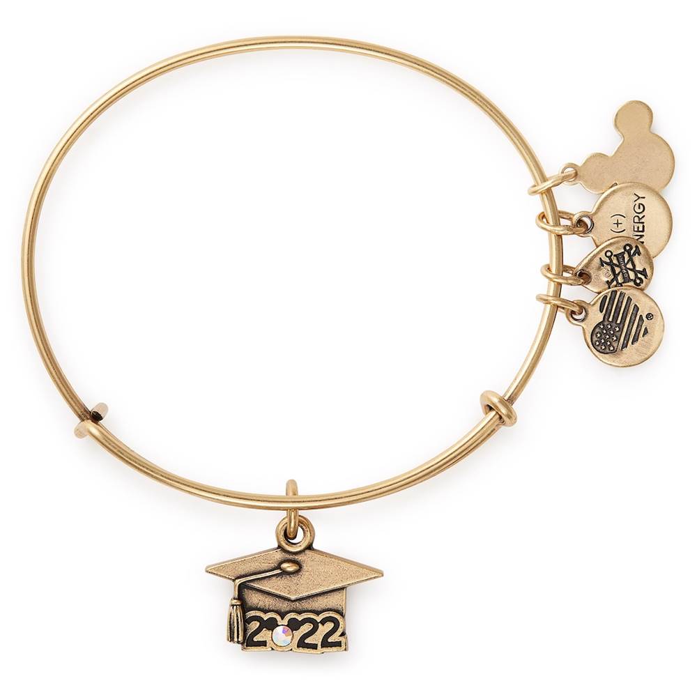 Celebrate your accomplishment with this 2022 Graduation Ear Hat bangle from Alex and Ani. The adjustable goldtone bracelet features a detailed mortar board charm with the ''2022'' engraving incorporating a Mickey icon complete with Preciosa Crystal to commemorate your sparkling scholastic success.