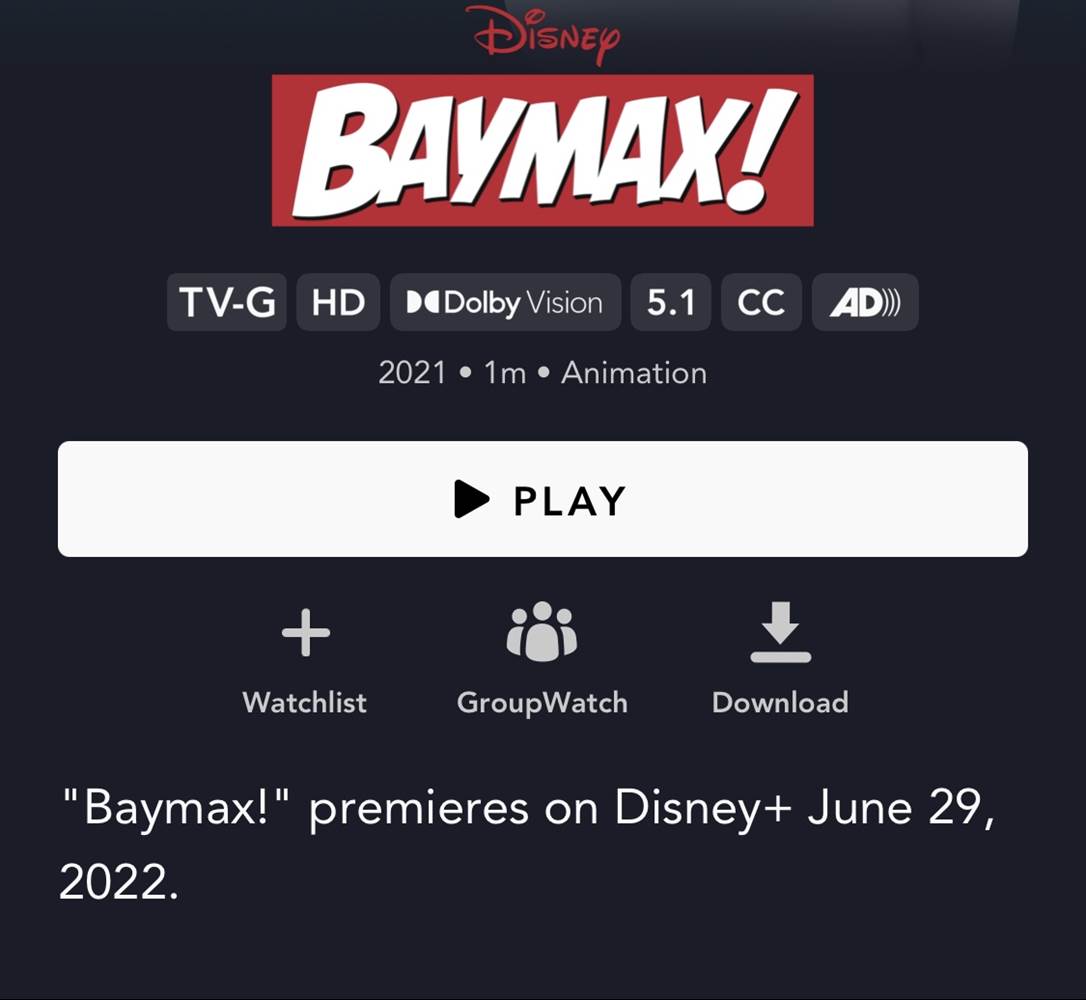 - The new animated series from Walt Disney Animation Studios, Baymax! Is set to debut on June 29th, 2022 based on a description in the Disney+ app.
