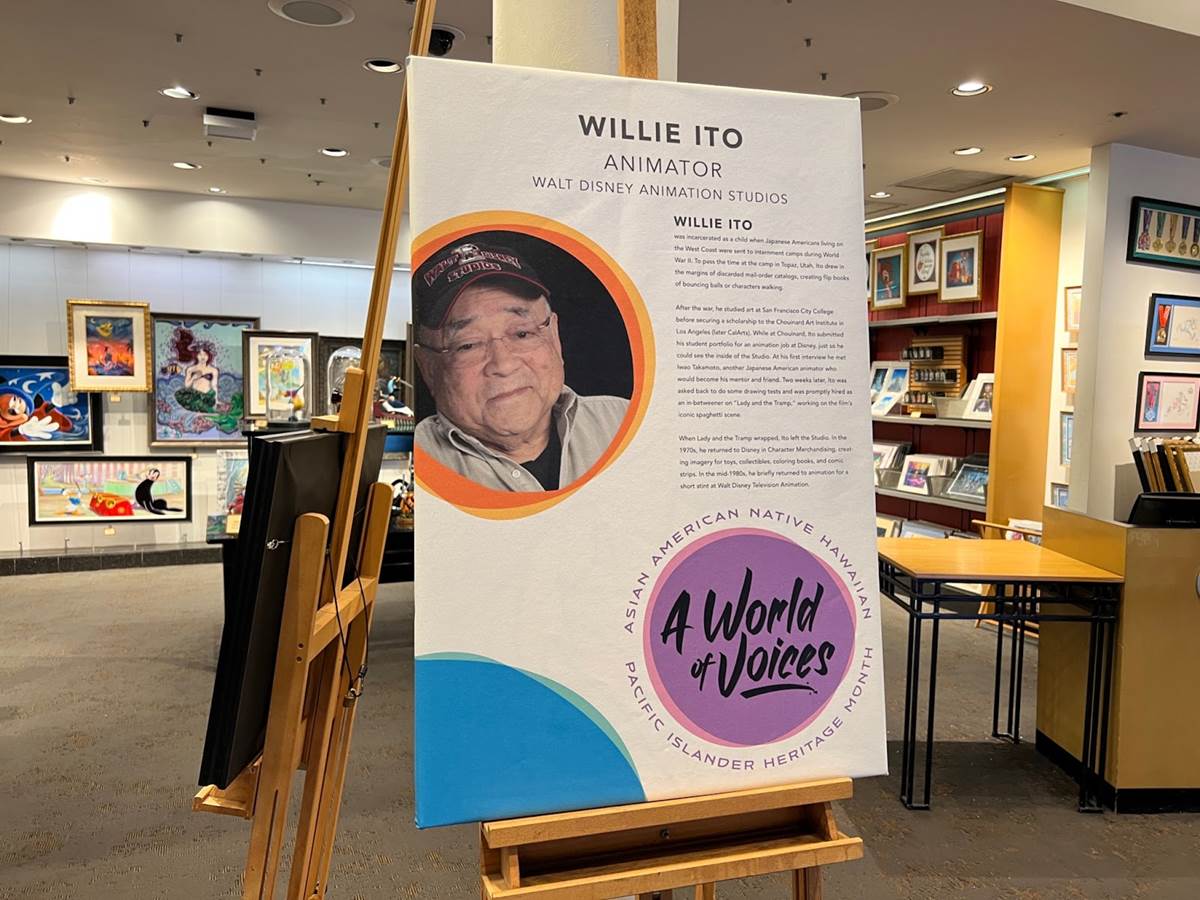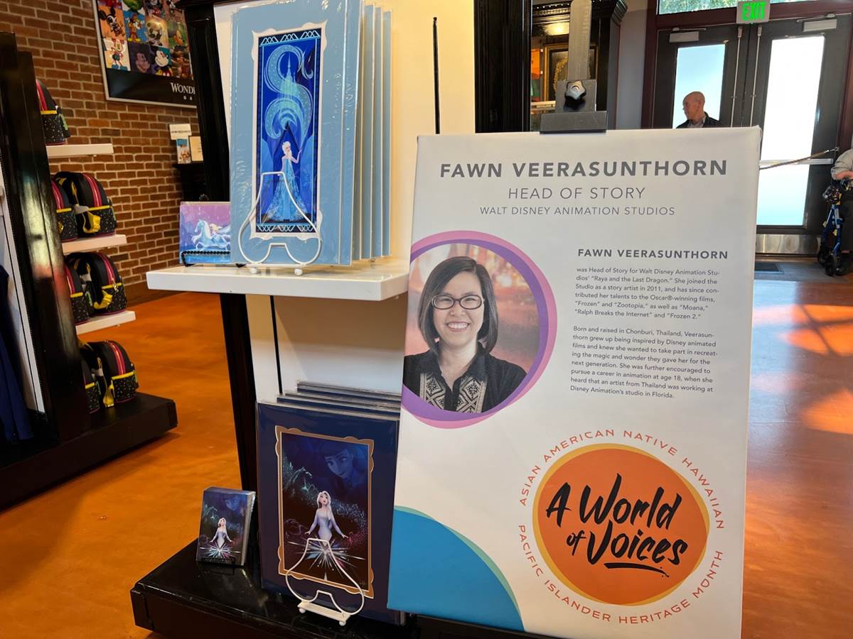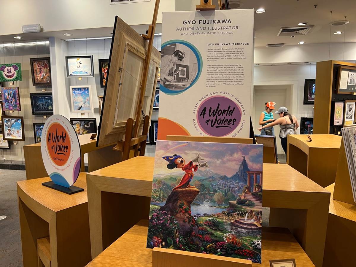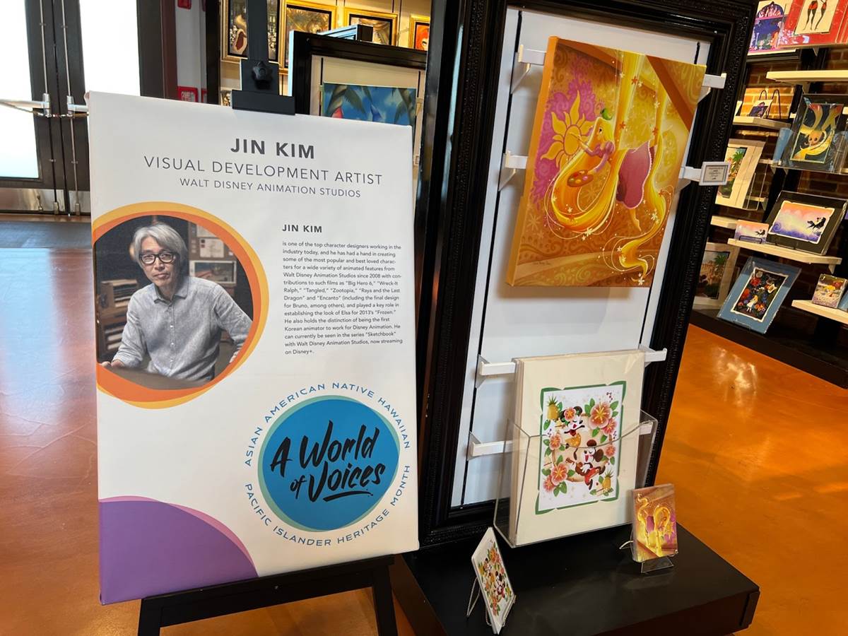 The Art of Disney store in the Marketplace features multiple tributes to Asian American Disney animators alongside artwork inspired by characters they worked on.