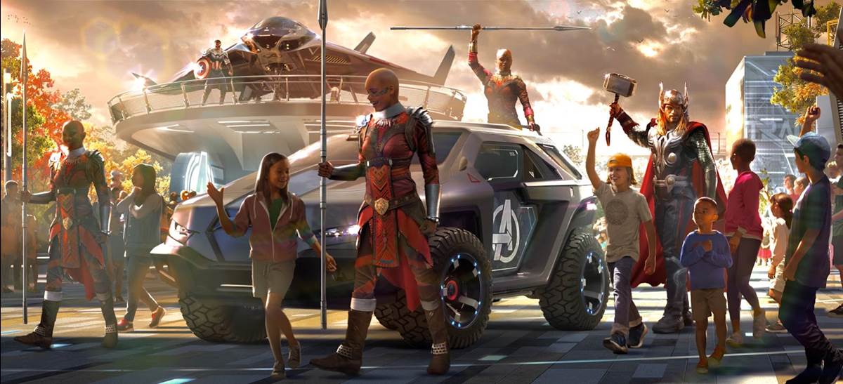 - As with the Avengers Campus at Disney California Adventure, you’ll find many of your favorite Marvel super heroes roaming the area. The concept art above features the Dora Milaje, Thor, and Sam Wilson next to the Quinjet.