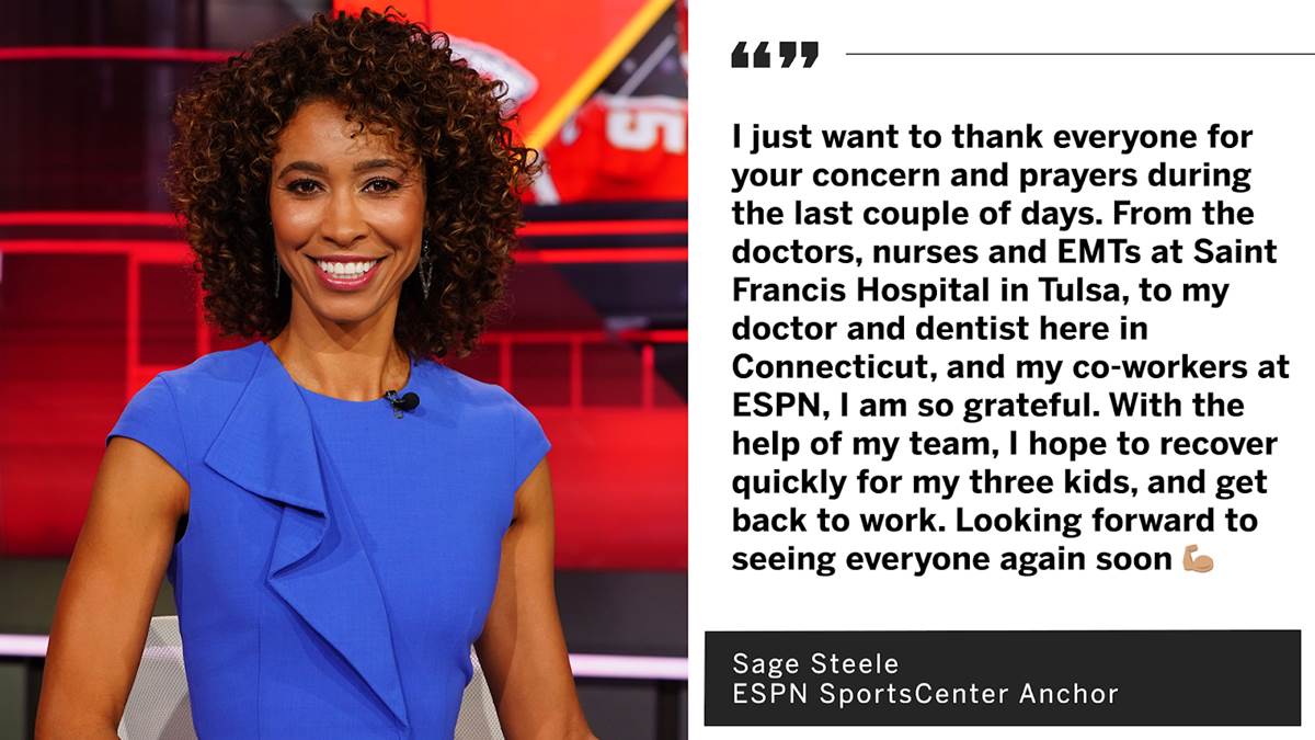 - She has released a statement and said: “I want to thank everyone for your concern and prayers during the last couple of days. From the doctors, nurses and EMTs at Saint Francis Hospital in Tulsa, to my doctor & dentist here in Connecticut, and my coworkers at ESPN, I am so grateful. With the help of my team, I hope to recover quickly for my 3 kids, and get back to work. Looking forward to seeing everyone again soon."