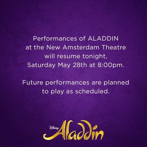 - Following last night’s cancelation of Aladdin on Broadway at The New Amsterdam Theatre, the show has announced that performances will resume tonight at 8:00 p.m. EST.