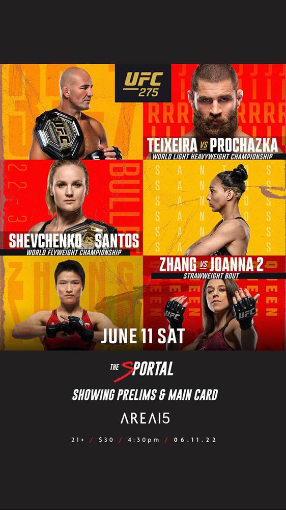 - Fans are invited to catch all the action during an immersive viewing of UFC 275 in The Portal, AREA15’s 3D projection-mapped room. Enjoy a 360-degree fight experience on three 23-foot walls with state-of-the-art sound as well as a full bar with specials and a full restaurant menu from The Beast by Todd English. Guests are invited to come early to grab the best seats and great food during the prelims.