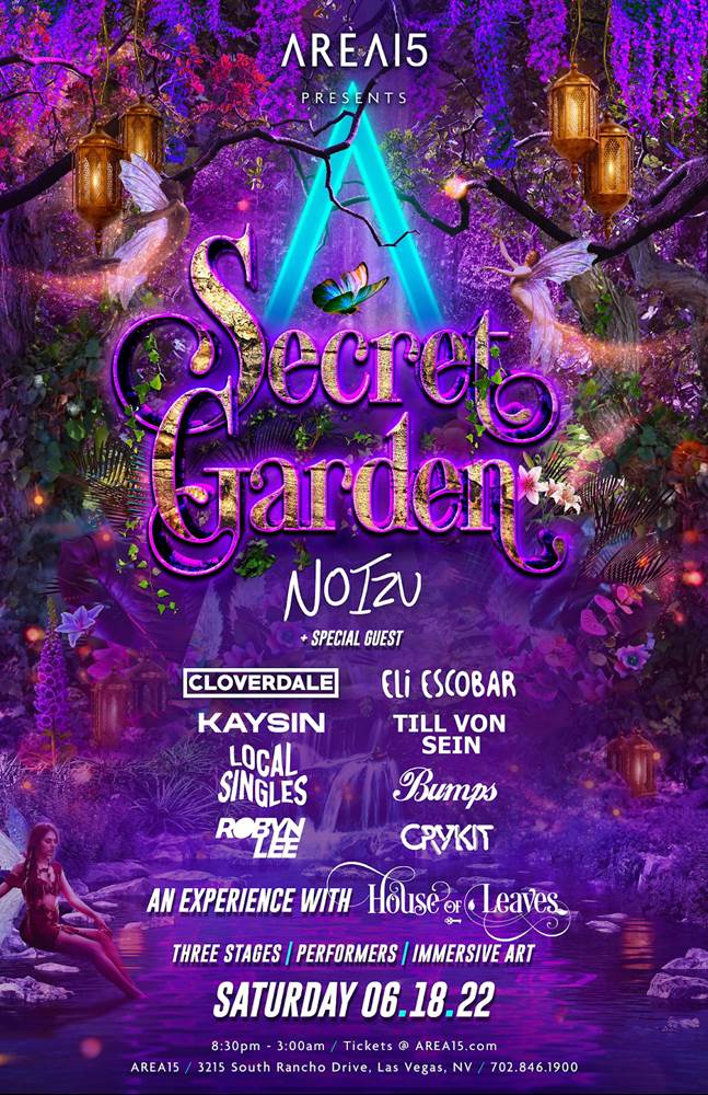 - “Secret Garden," an immersive full-venue experience party in partnership with House of Leaves will feature a headlining performance by Noizu. Fairies, forest sprites and woodland creatures are invited to wear their best costumes while dancing and frolicking through the ethereal world full of lush soundscapes. Guests will also enjoy bewildering art installations, roaming performers, delectable cocktails, sweets, treats and more.