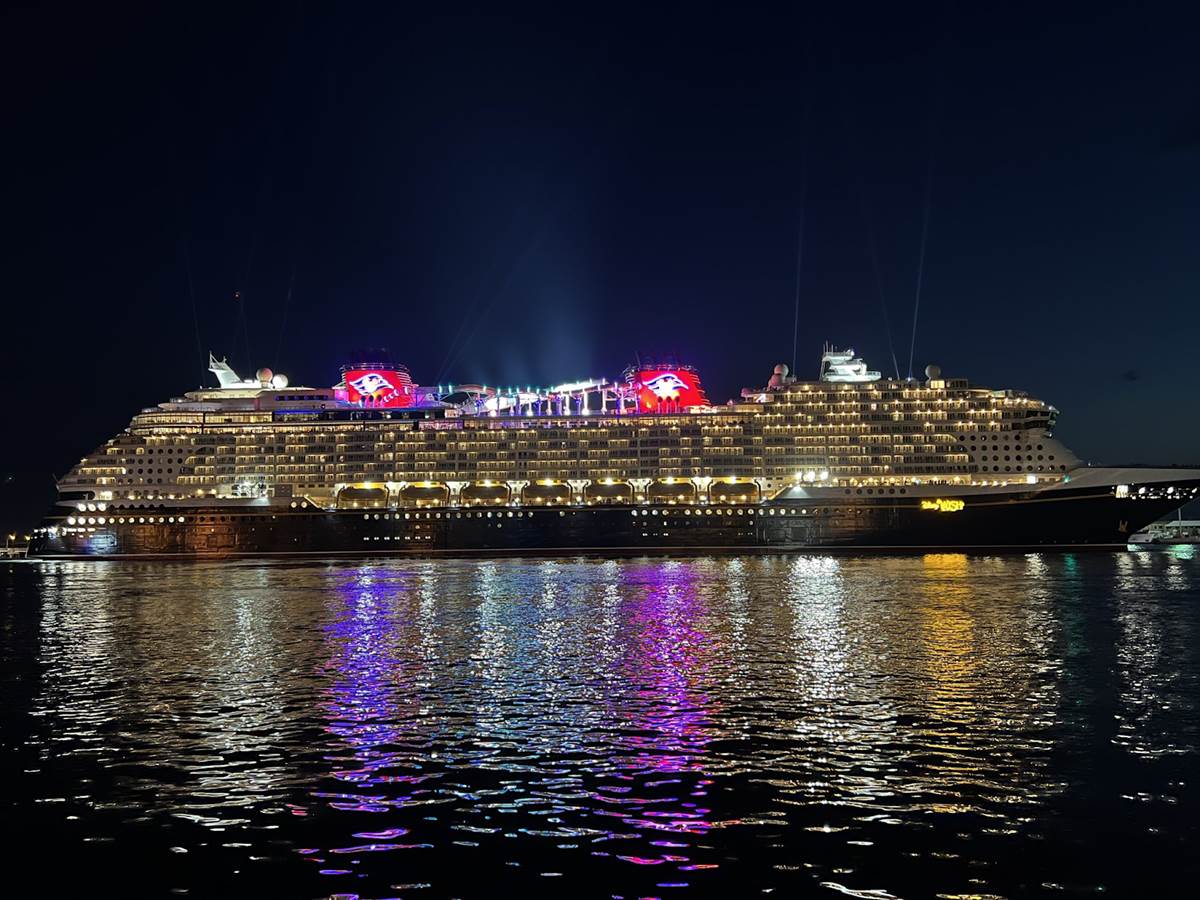 Out of the darkness of the early morning hours, fans in Port Canaveral, Florida lined up along the ocean shores to watch the arrival of the Disney Wish, the newest ship in the Disney Cruise Line fleet, arrive at its new home.