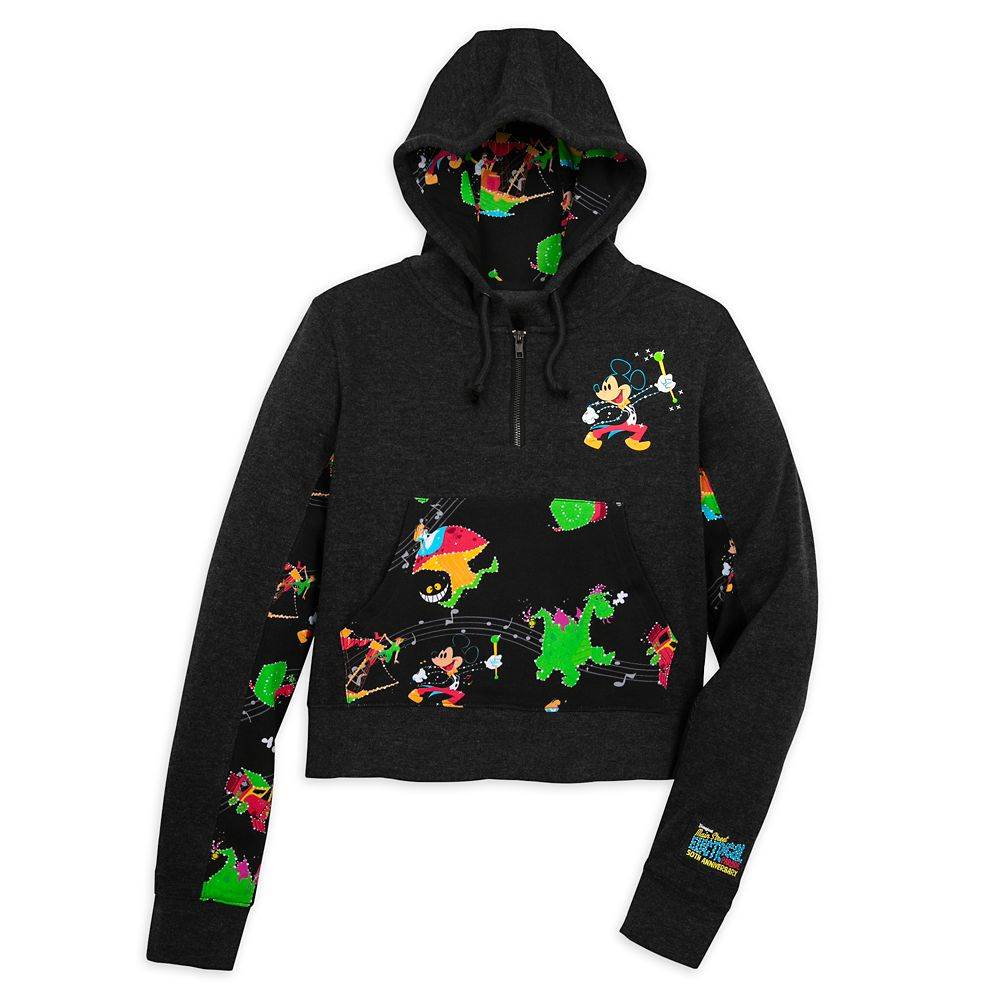 Stay warm and glowing all year long with this absolutely fun 1/4 zip pullover hoodie. The front and sleeves feature the whimsical floats in a playful artistic style, and the left chest and shoulder is home to a glow in the dark Mickey logo.