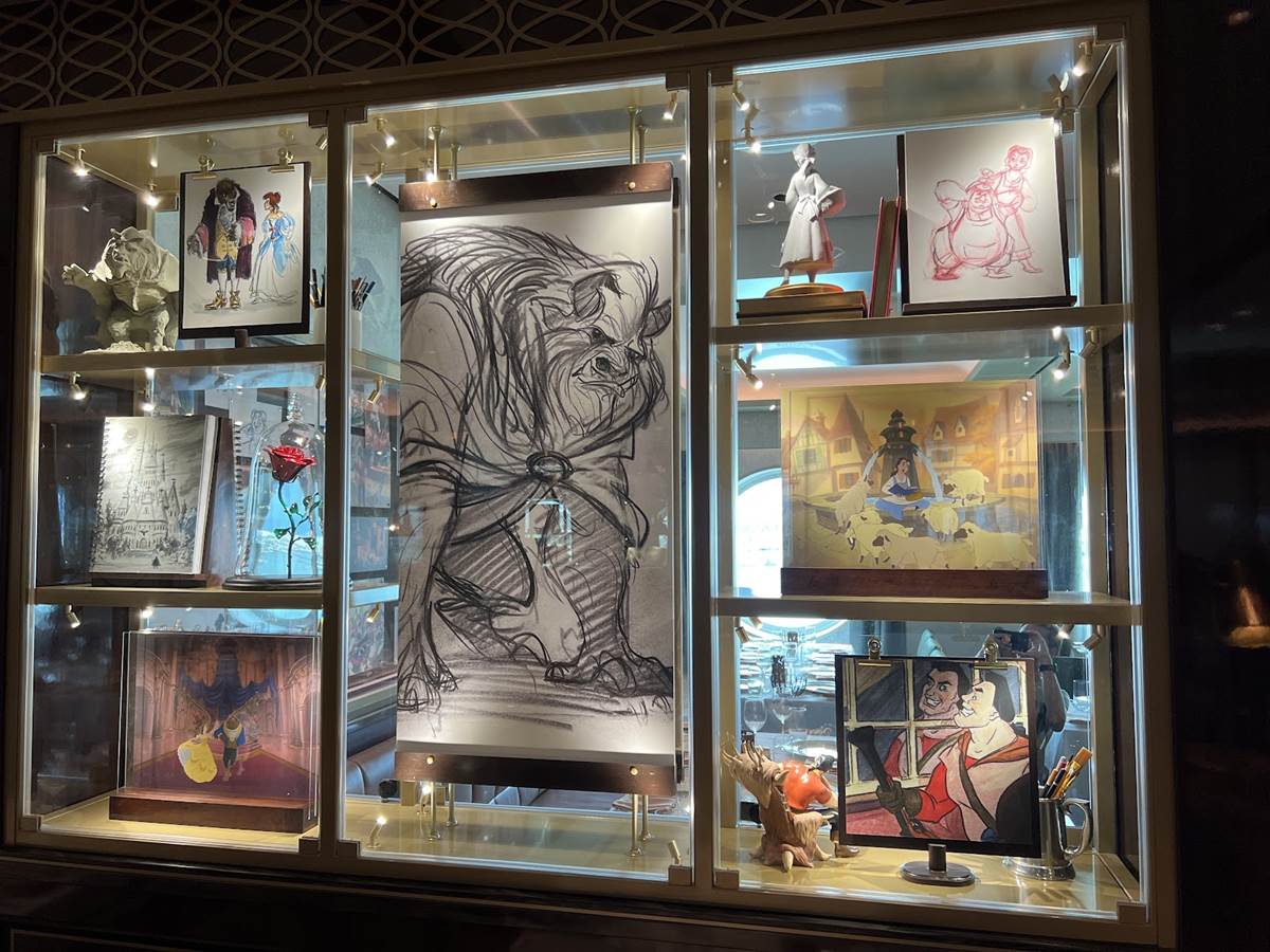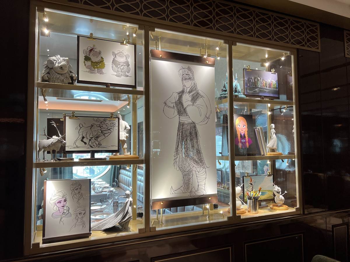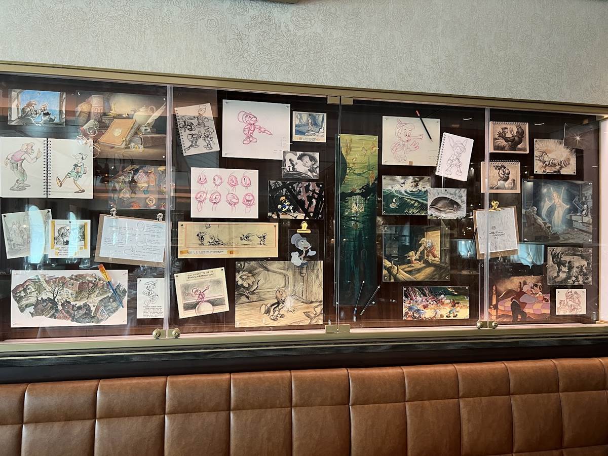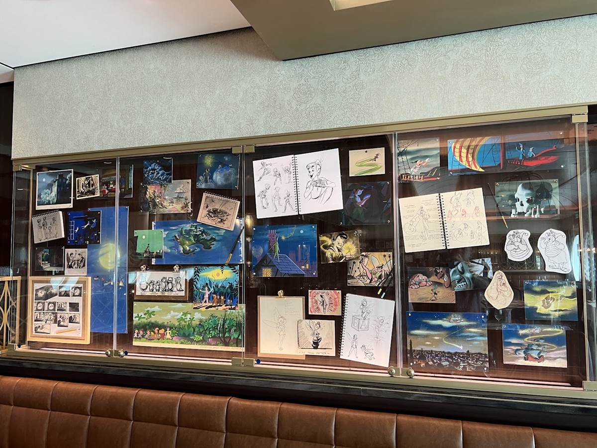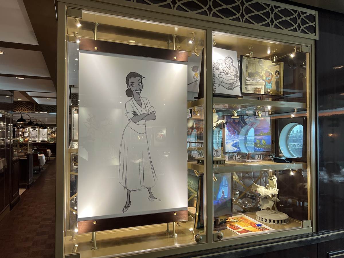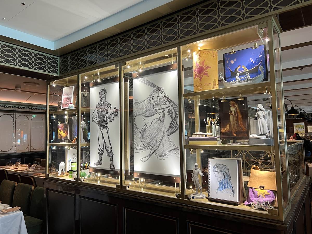 Adorning the walls and ornate glass cases around the restaurant are more than 1,000 drawings, props and other tools of the animation trade showcasing 16 films from the Walt Disney Animation Studio that embody the ship’s themes of enchantment and wish fulfillment. Take a look: