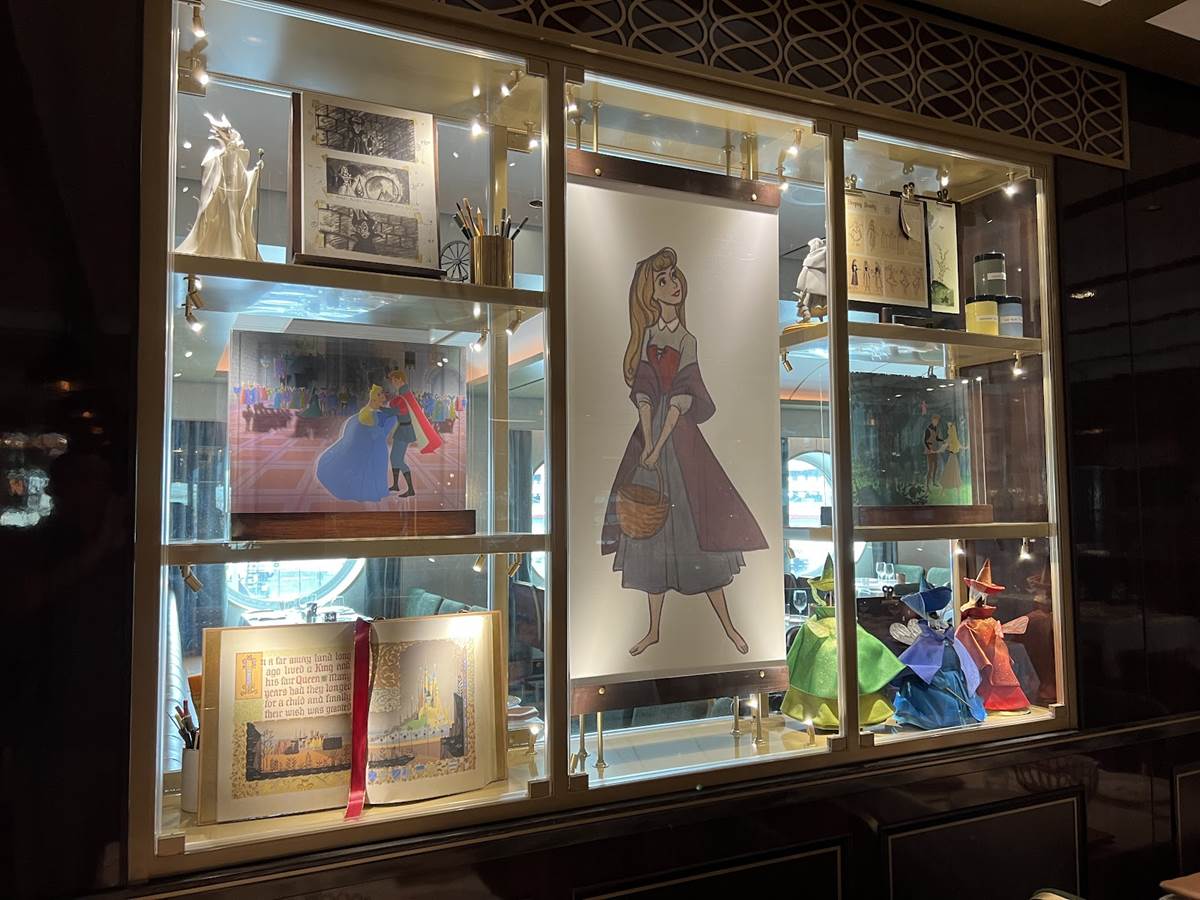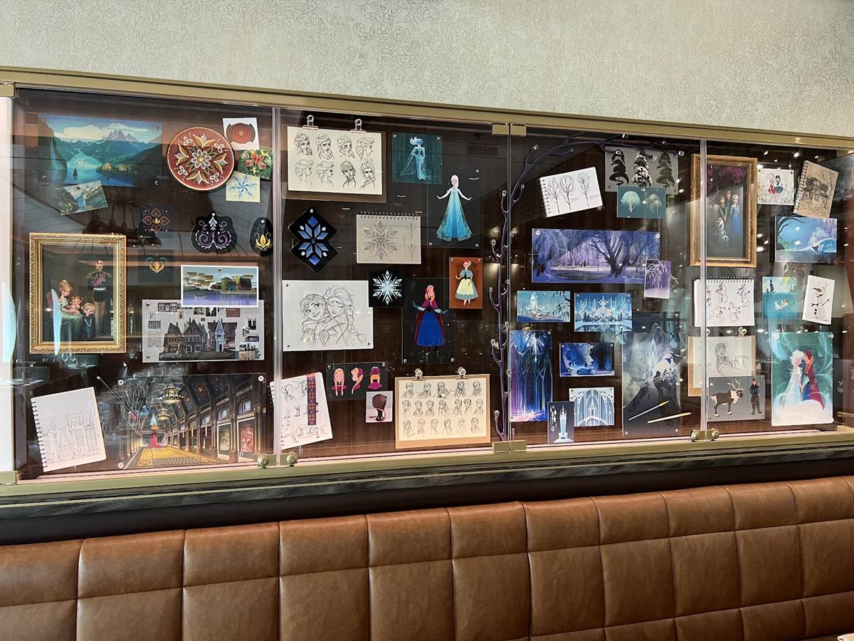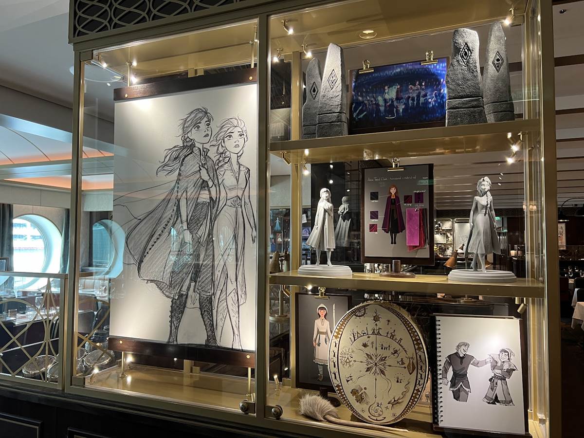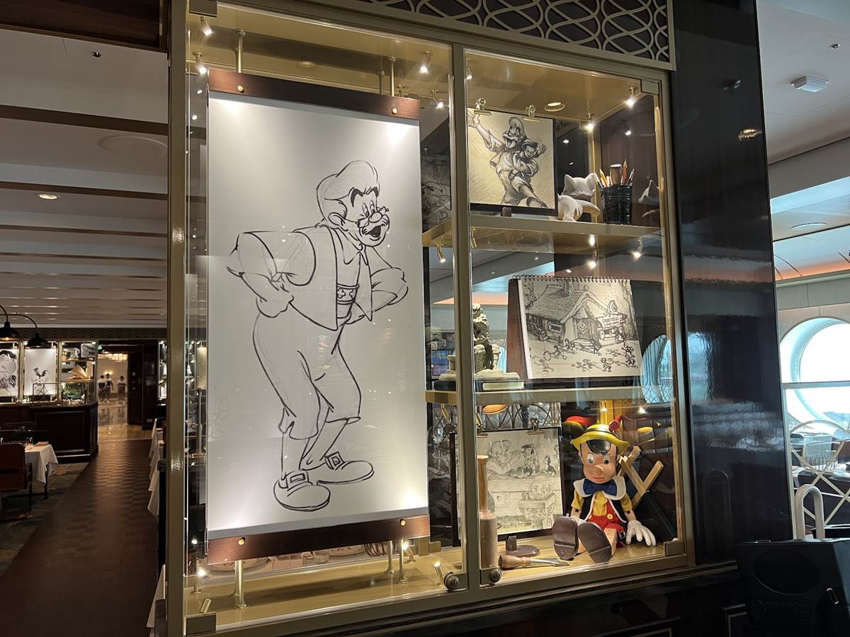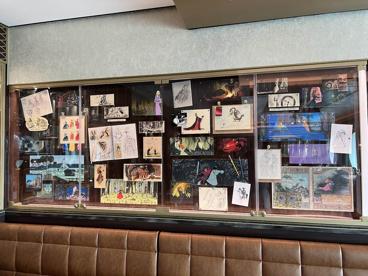 Adorning the walls and ornate glass cases around the restaurant are more than 1,000 drawings, props and other tools of the animation trade showcasing 16 films from the Walt Disney Animation Studio that embody the ship’s themes of enchantment and wish fulfillment. Take a look: