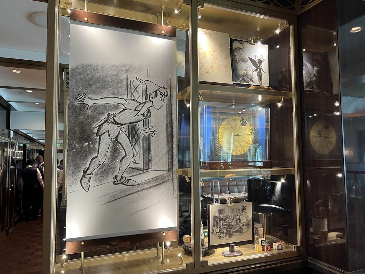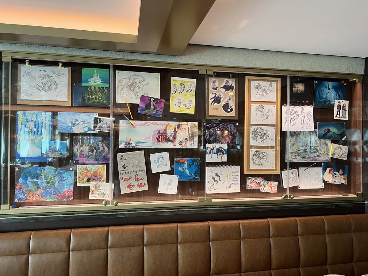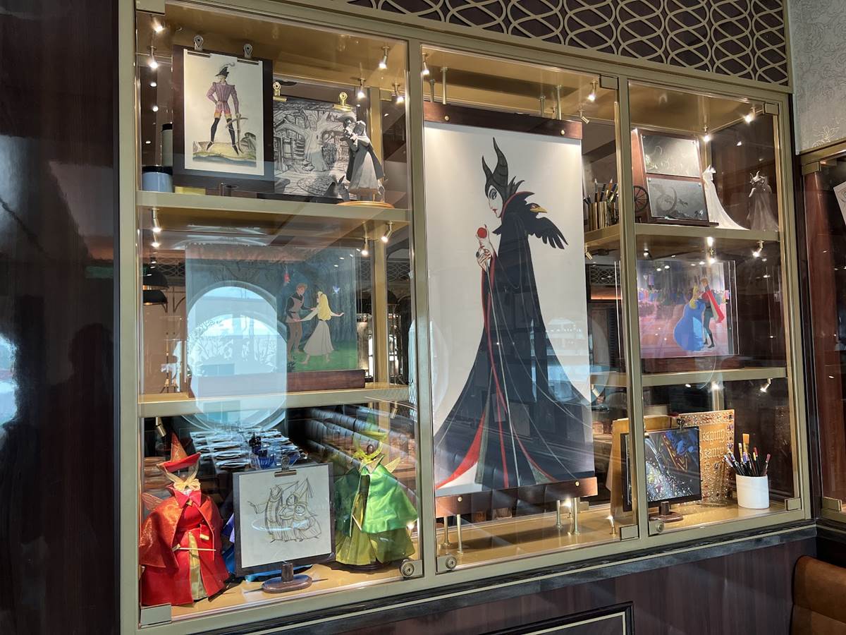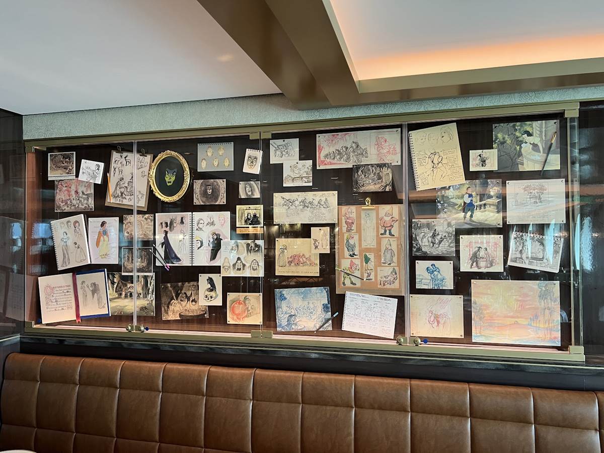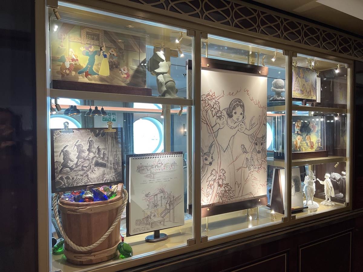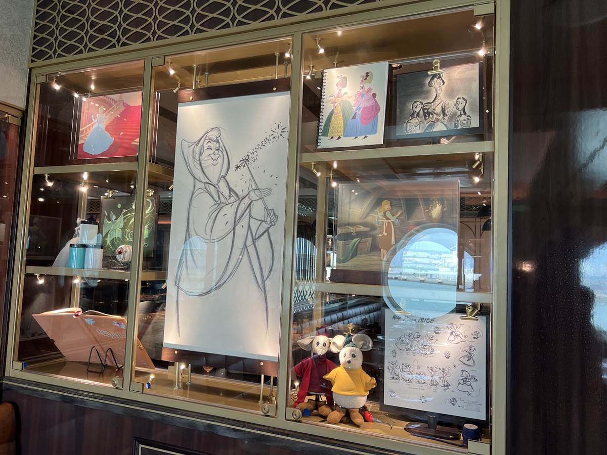 Adorning the walls and ornate glass cases around the restaurant are more than 1,000 drawings, props and other tools of the animation trade showcasing 16 films from the Walt Disney Animation Studio that embody the ship’s themes of enchantment and wish fulfillment. Take a look: