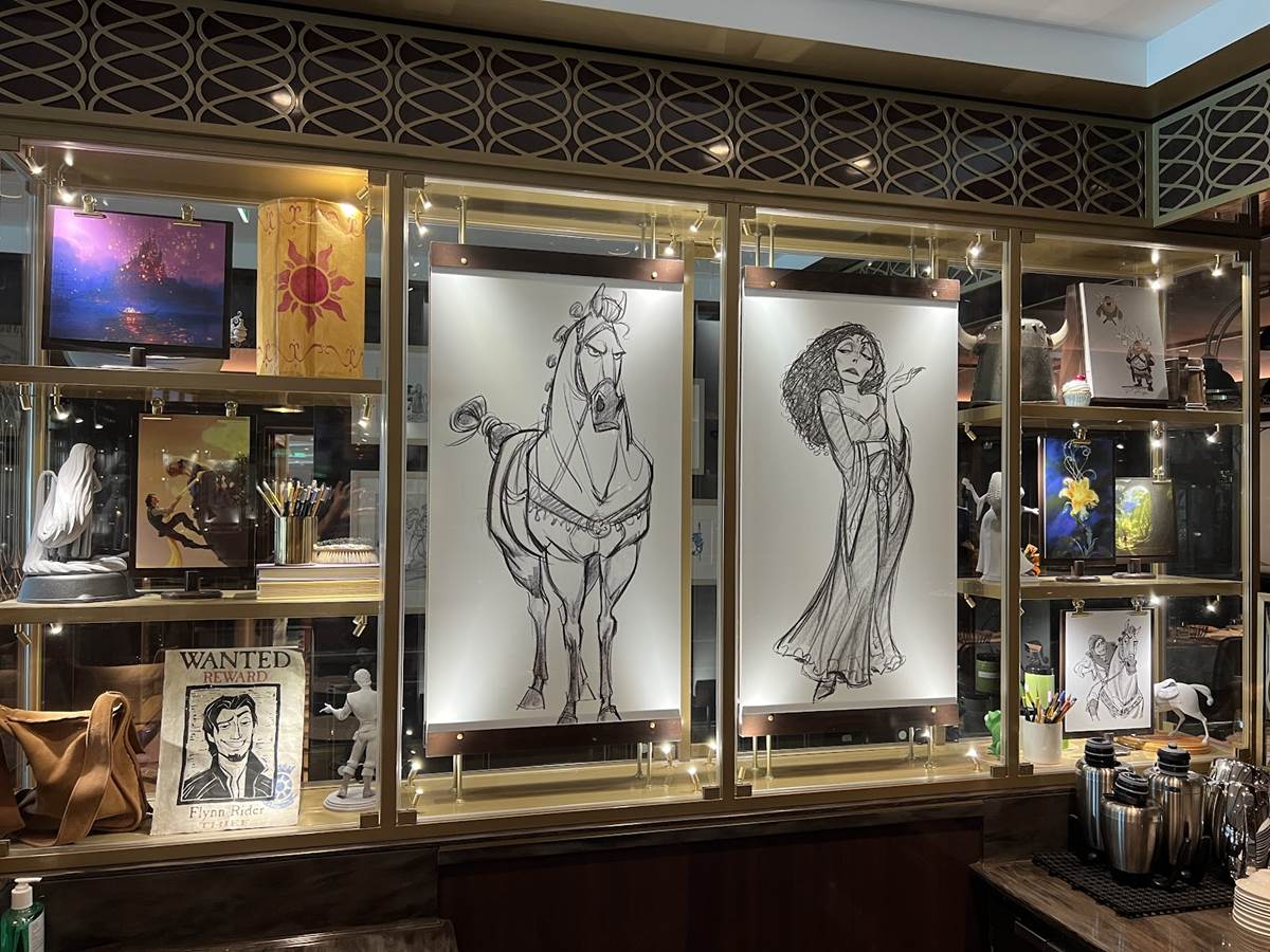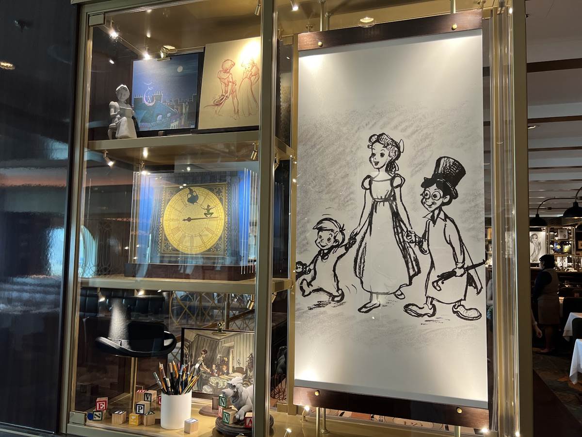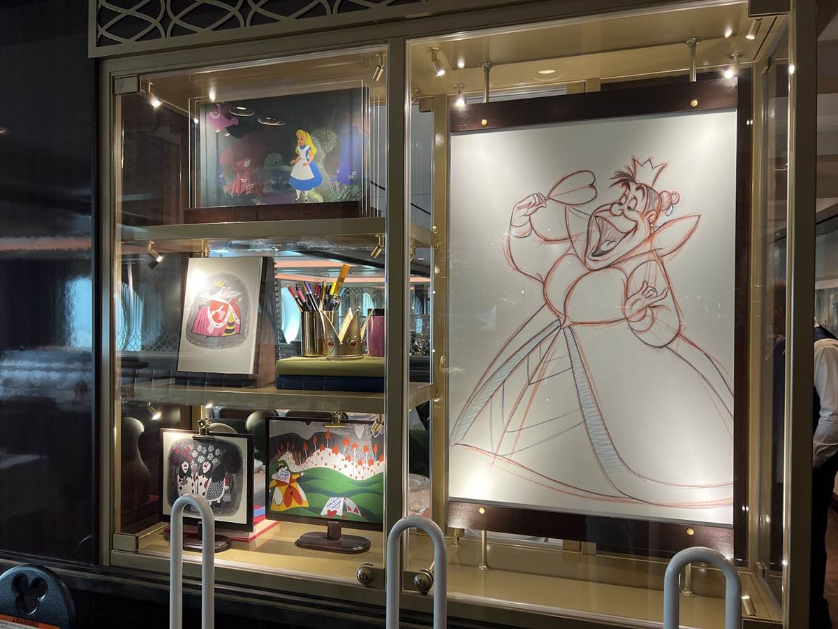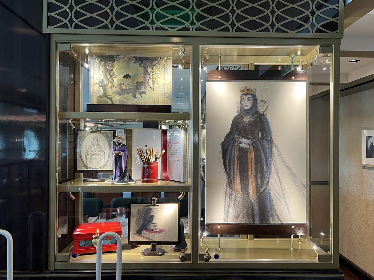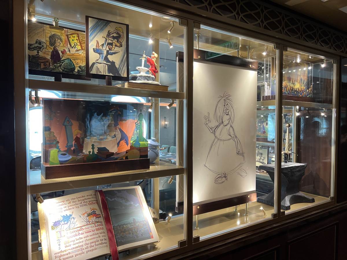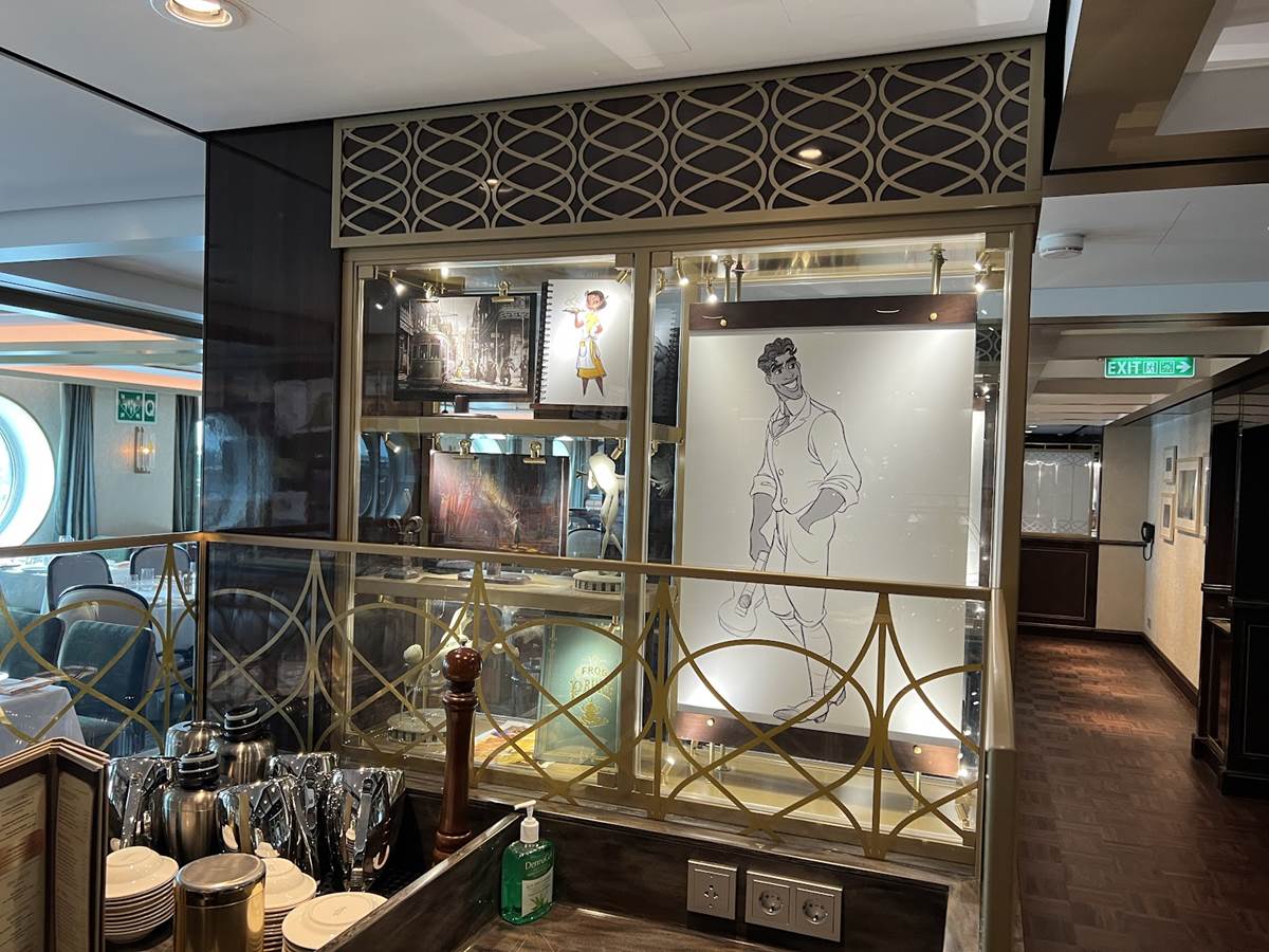Adorning the walls and ornate glass cases around the restaurant are more than 1,000 drawings, props and other tools of the animation trade showcasing 16 films from the Walt Disney Animation Studio that embody the ship’s themes of enchantment and wish fulfillment. Take a look: