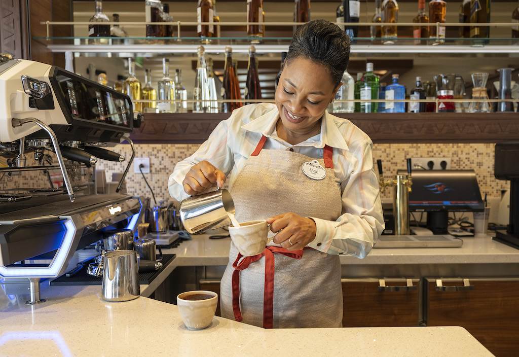 “A Disney Cruise Line guest favorite, Cove Café is a chic poolside lounge aboard the Disney Wish, offering gourmet coffees, teas, specialty drinks and treats throughout the day. The sophisticated yet casual spot reflects the Oceania-inspired artistry of Disney Animation Studios’ Moana."