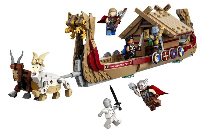 - Battle onboard Thor’s flying ship. The longboat is drawn through the skies by legendary goats Toothgnasher and Toothgrinder, who are raised off the ground so kids can easily push the ship along as they play. The set includes 5 mini figures –Thor, Mighty Thor, Valkyrie, Korg and Gorr –and a host of weapons and accessories, including Thor’s Stormbreaker axe.