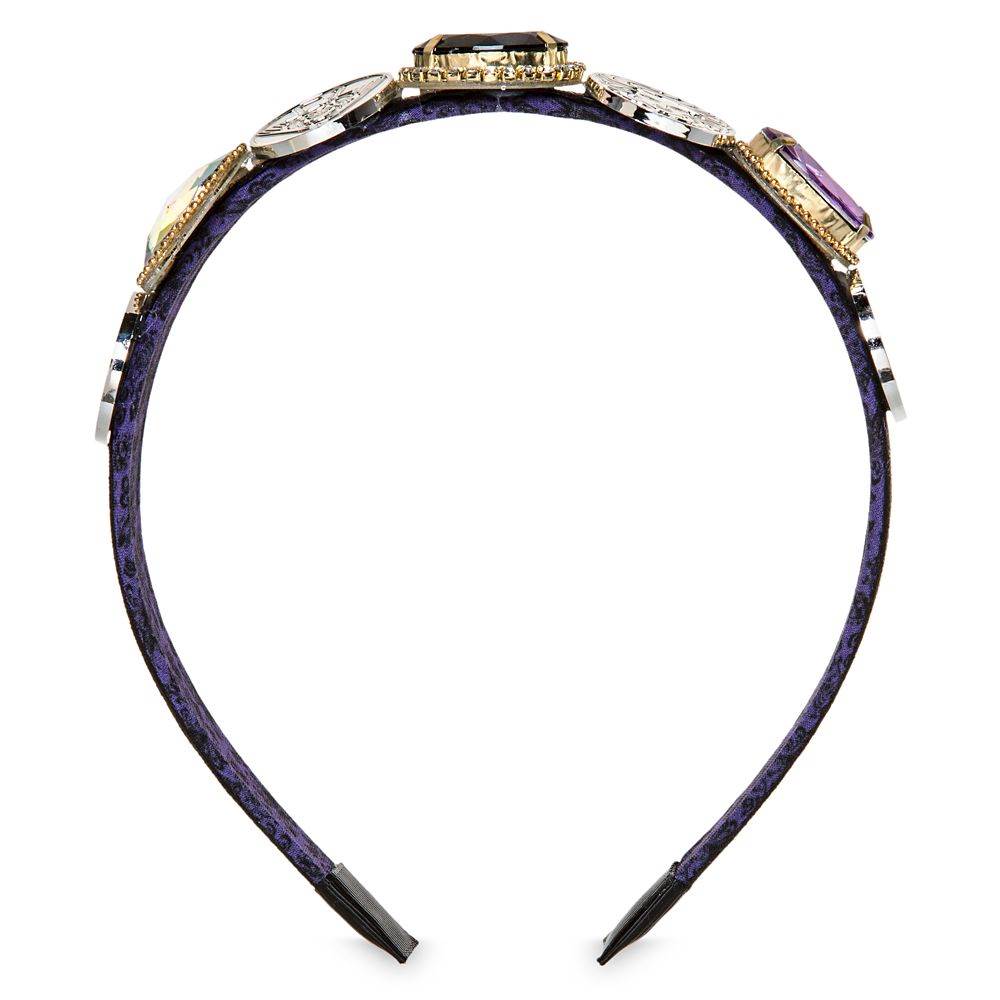 Celebrate the spooky ride with a gemstone headband that features colorful jewels and Haunted Mansion themed medallions featuring The Hatbox Ghost and Madame Leota. Tying the whole look together is the wallpaper pattern inside the band.