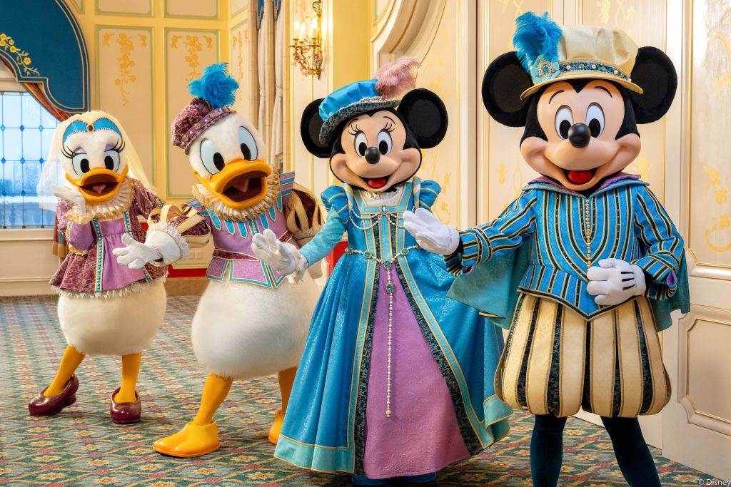 - The palatial atmosphere is elevated by the company of Mickey, Minnie, Donald and Daisy, all donning brand-new regalia accented by feathered hats, ruffled collars, regal capes and sumptuous pearls. Dressed in their best, they await guests as the lords and ladies of this royal court, where they welcome all to fill the halls with music and dance.