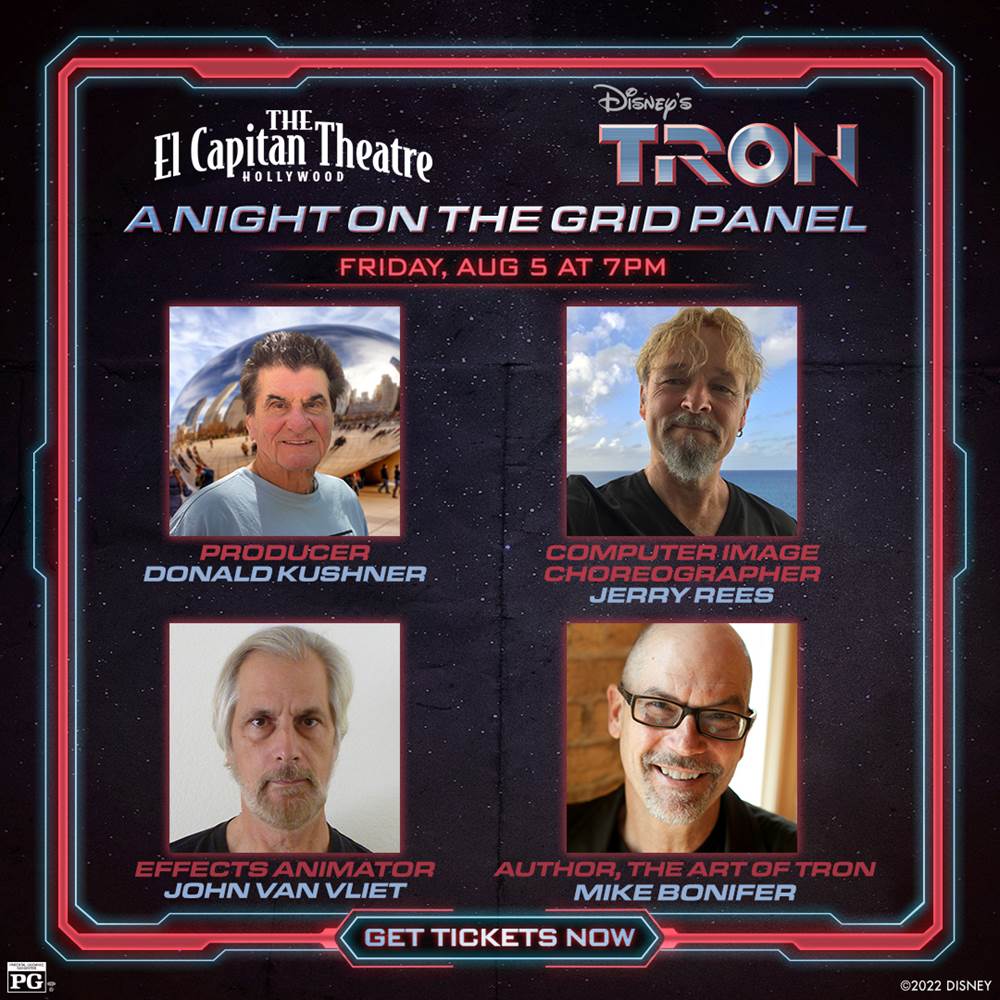 - Disney’s Tron producer Donald Kushner, computer image choreographer Jerry Rees and effects animator John Van Vliet have joined El Capitan Theatre’s Night on the Grid panel with The Art of Tron author Mike Bonifer August 5 at 7pm.