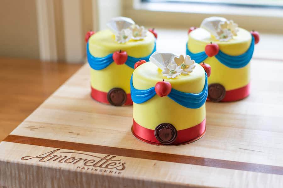 - Snow White Cupcake: Vanilla cupcake filled with a spiced caramel apple filling topped with caramel buttercream, red chocolate dip, and a red bow