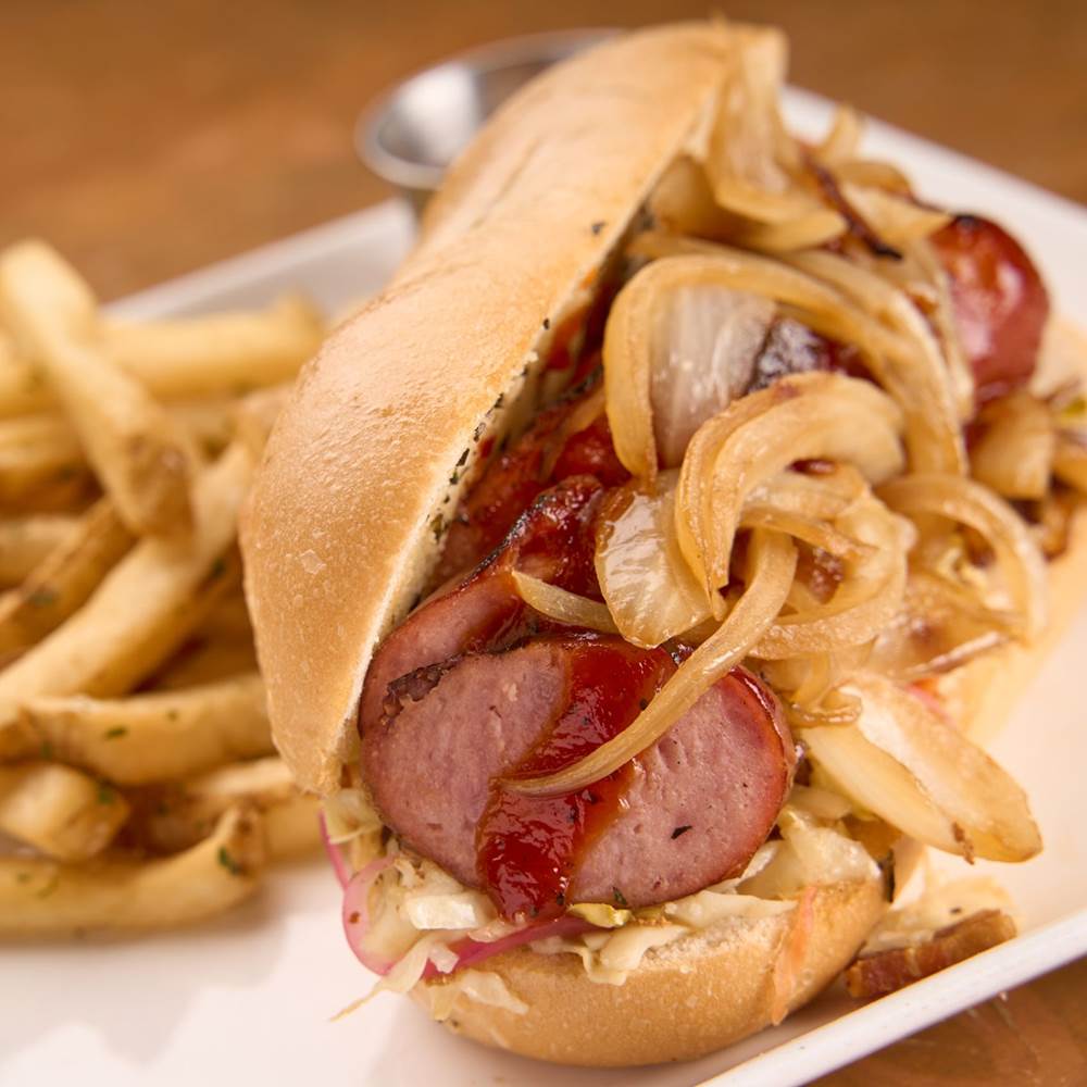 - Smokehouse Currywurst – Spicy hot link, currywurst sauce, bacon braised sauerkraut, caramelized onions, steak roll