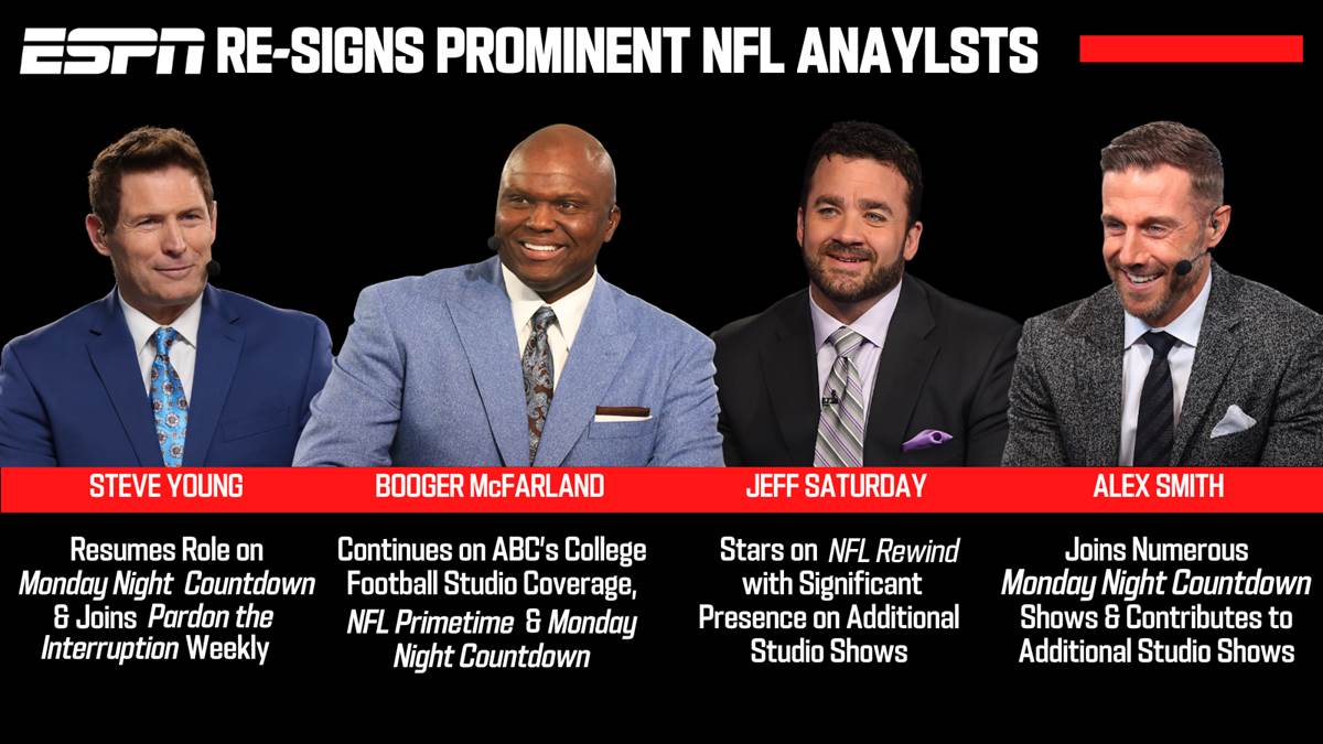 - ESPN has re-signed Pro Football Hall of Famer Steve Young, Super Bowl Champions Booger McFarland and Jeff Saturday, and Pro Bowl Quarterback Alex Smith ahead of the 2022 NFL Season. The four analysts will continue to be showcased across ESPN’s studio programming on a regular basis, providing reaction to breaking news and top NFL storylines along with strategic insight into on-the-field and roster maneuvers.