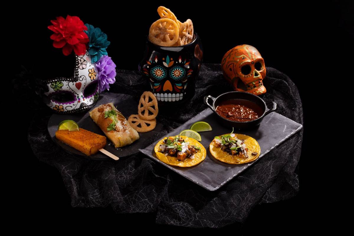 - Día de los Muertos themed items: Includes offerings inspired by Latin flavors such as Tamales Día de los Muertos (gluten-free) – pork tamales topped with red mole sauce and cotija cheese; and Roasted Sweet Potato & Mushroom Street Tacos (vegan and gluten-free) – roasted sweet potato and mushroom tacos topped with onions, vegan crumbled cheese and cilantro; also served with birria consommé
