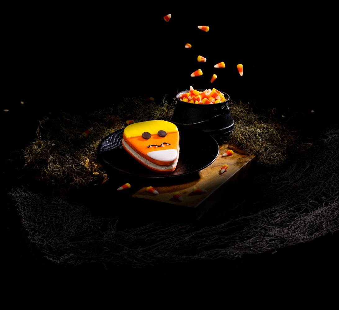 - Major Sweets Ice Cream Sandwich (inspired by “Sweet Revenge" scare zone): Candy-corn sugar cookies filled with sweet corn ice cream (vegetarian)