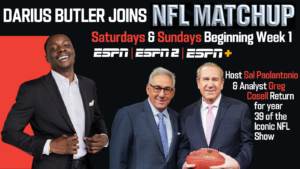 ESPN has signed nine-year NFL veteran Darius Butler to appear on the iconic NFL Matchup show, joining long-time host Sal Paolantonio and analyst Greg Cosell. The trio will make their debut together when the new season of NFL Matchup premieres on Saturday, Sept. 10, at 8:30 a.m. ET on ESPN2.