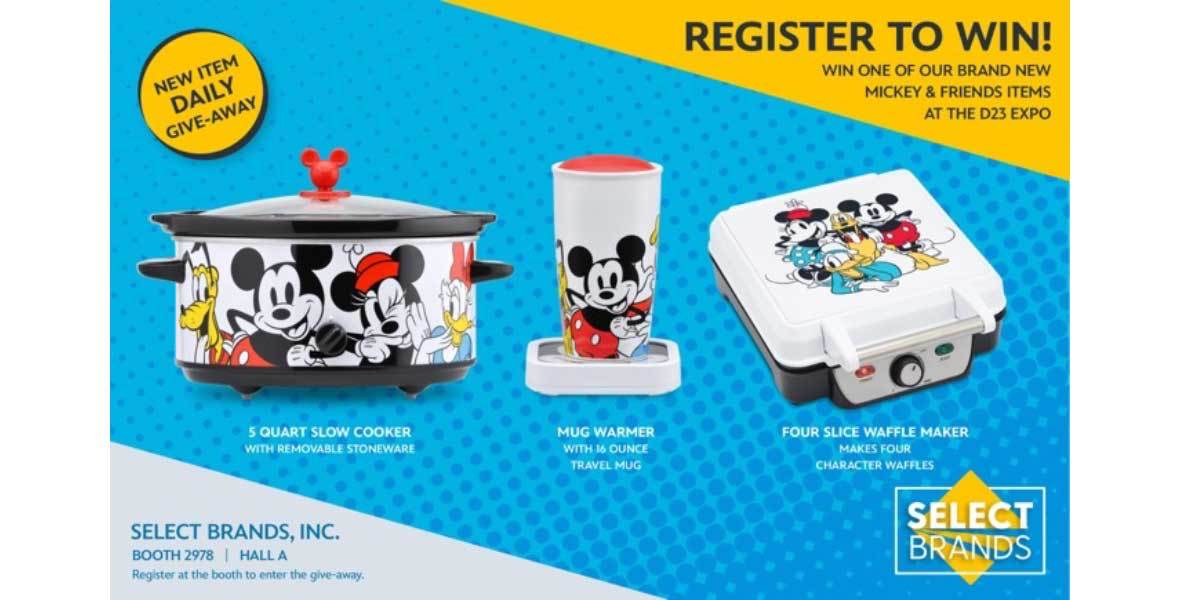 - Select Brands is excited to launch the all-new Mickey & Friends kitchen appliance collection at the 2022 D23 Expo. Stop by Select Brands booth No. 2978 in Hall A to be among the first to purchase the new Mickey & Friends appliances at a special D23 Expo price. When you stop by, you’ll also have the chance to enter their daily D23 Expo giveaway and win one of the new Mickey & Friends appliances.
