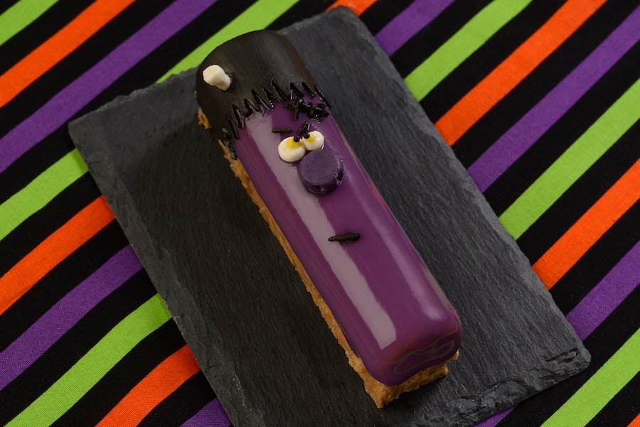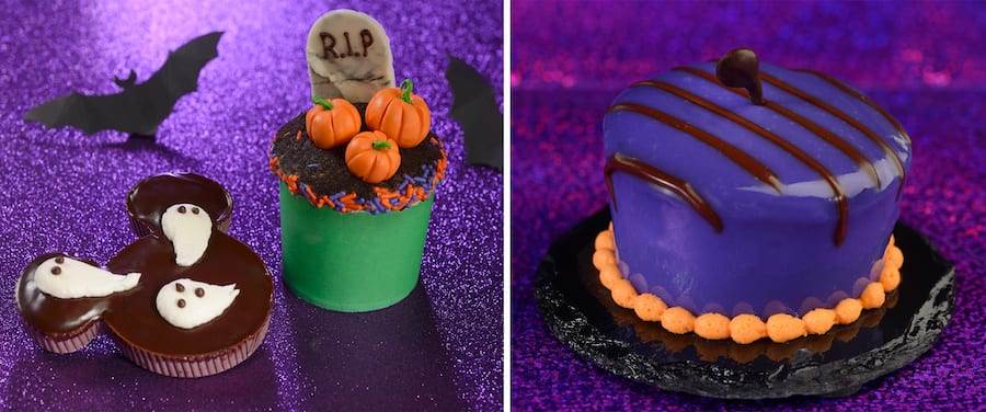- Madame Leota Dark Chocolate Cake: Devil’s Food mini cake filled with dark chocolate ganache topped with chocolate glaze and marshmallow webs (New)