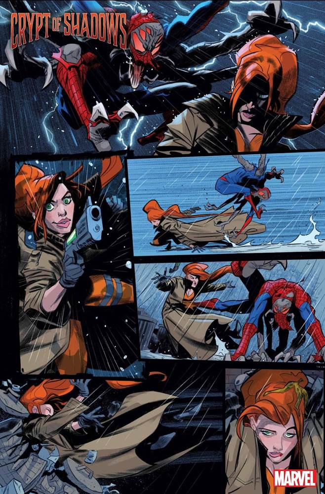 - A page from "Down Came the Rain" by Condon and Galan pits Elsa Bloodstone against a mutated, arachnid-like Spider-Man creature, while Lore and Darboe's "Neither Big Nor Bad" sees Bloodline battle a fiery entity with a prerecorded invocation.