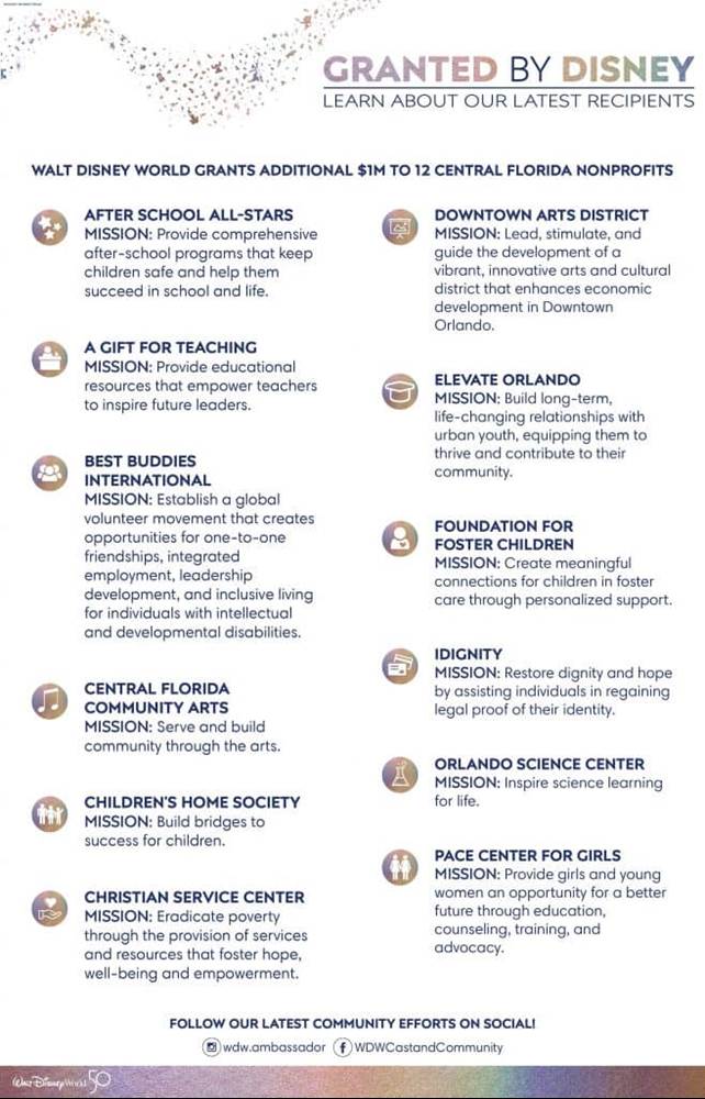 As the celebration of Walt Disney World’s 50th anniversary continues, the resort continues to give back to Central Florida. The Disney Parks Blog has shared that Walt Disney World has donated an additional $1 million to 12 local nonprofits.