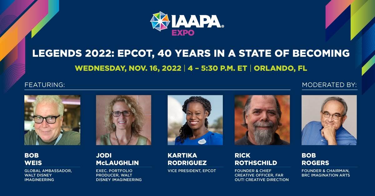 - Michael Shelton, vice president and executive director, IAAPA North America, said: “We could not be happier with the speaker lineup we have for this year’s Legends panel. This popular session lets IAAPA shine a spotlight on just some of the outstanding industry leaders who have truly carved the path to where we are today. Getting to focus on Epcot as it turns 40 should offer greater insight into the future of the park and provide inspiration to everyone in attendance."