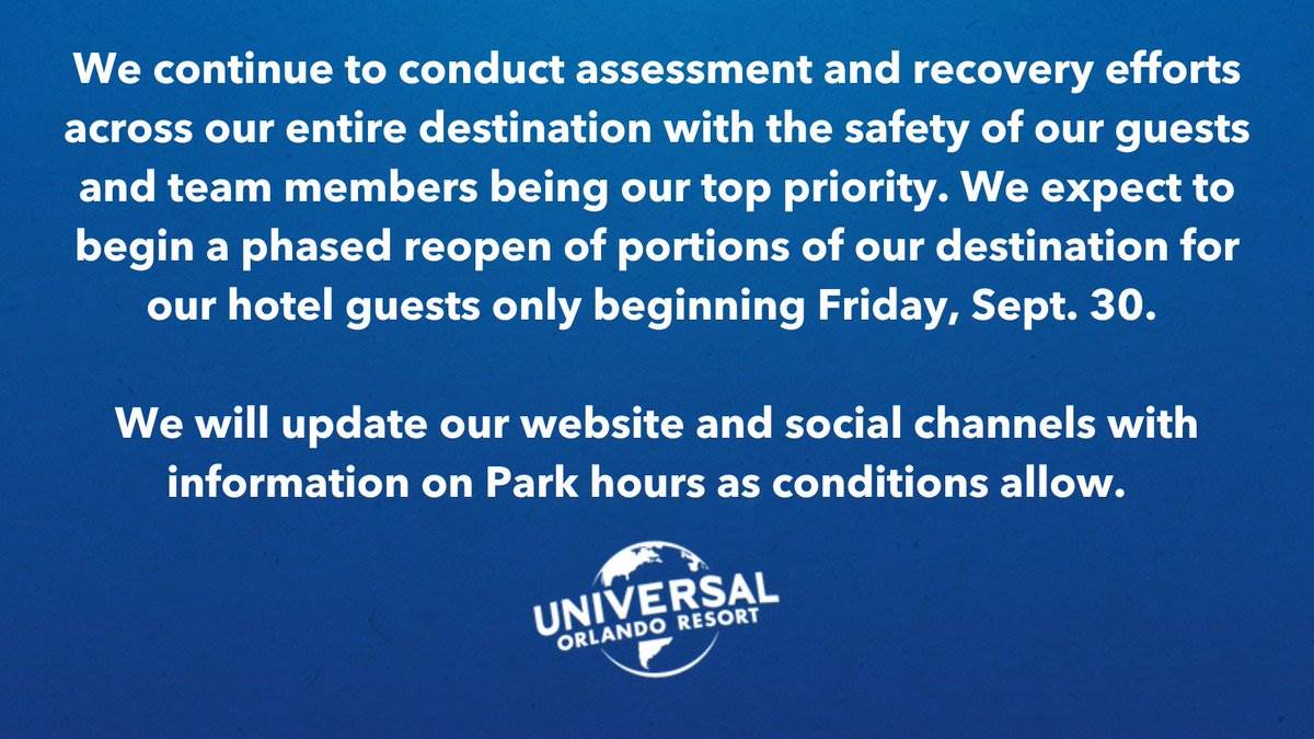 - Universal Orlando plans to reopen select areas of the Resort at some point tomorrow, September 30th.