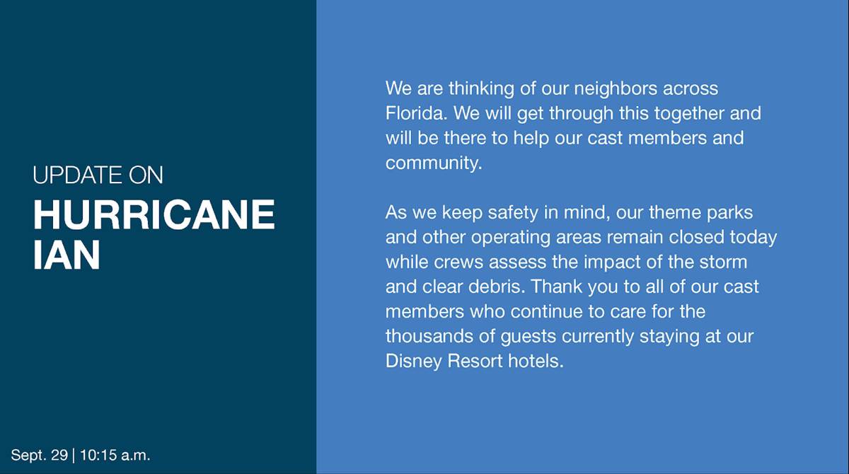 As we keep safety in mind, our theme parks and other operating areas remain closed today while crews assess the impact of the storm and clear debris. Thank you to all of our cast members who continue to care for the thousands of guests currently staying at our Disney Resort hotels."