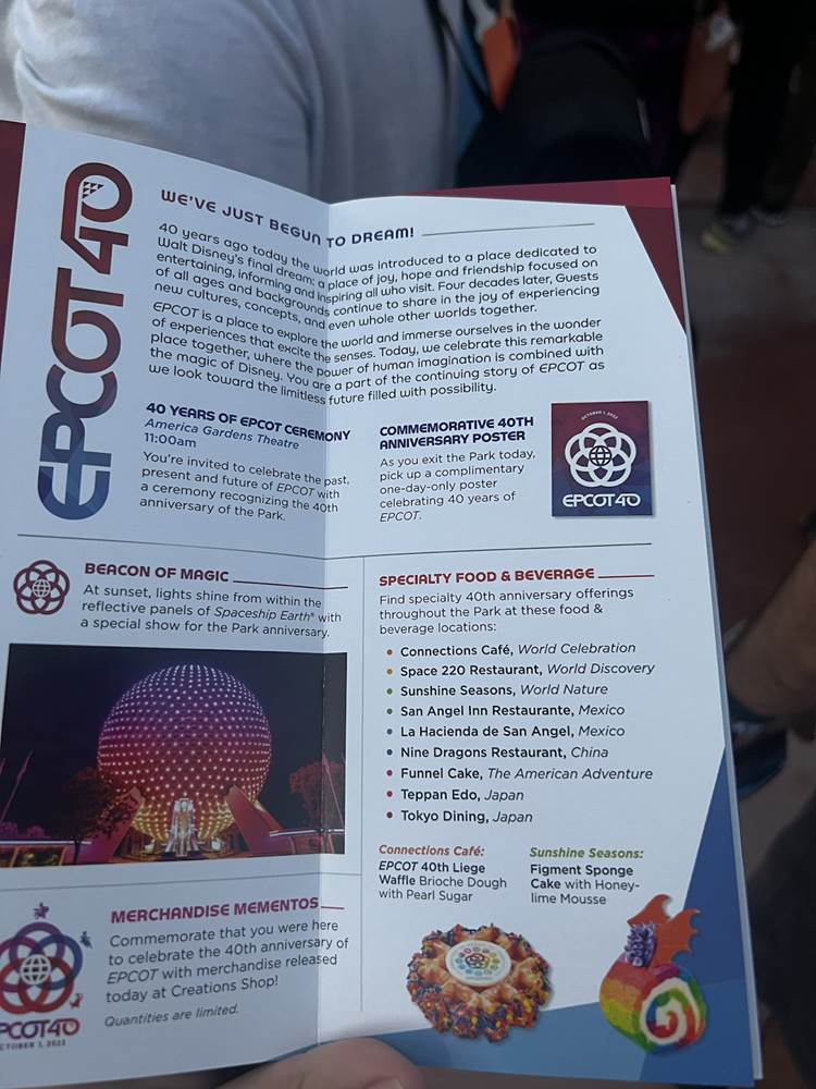 - Revealed in the commemorative park map for the day, there will be a 40 Years of EPCOT Ceremony taking place at the America Gardens Theatre at 11:00 a.m.