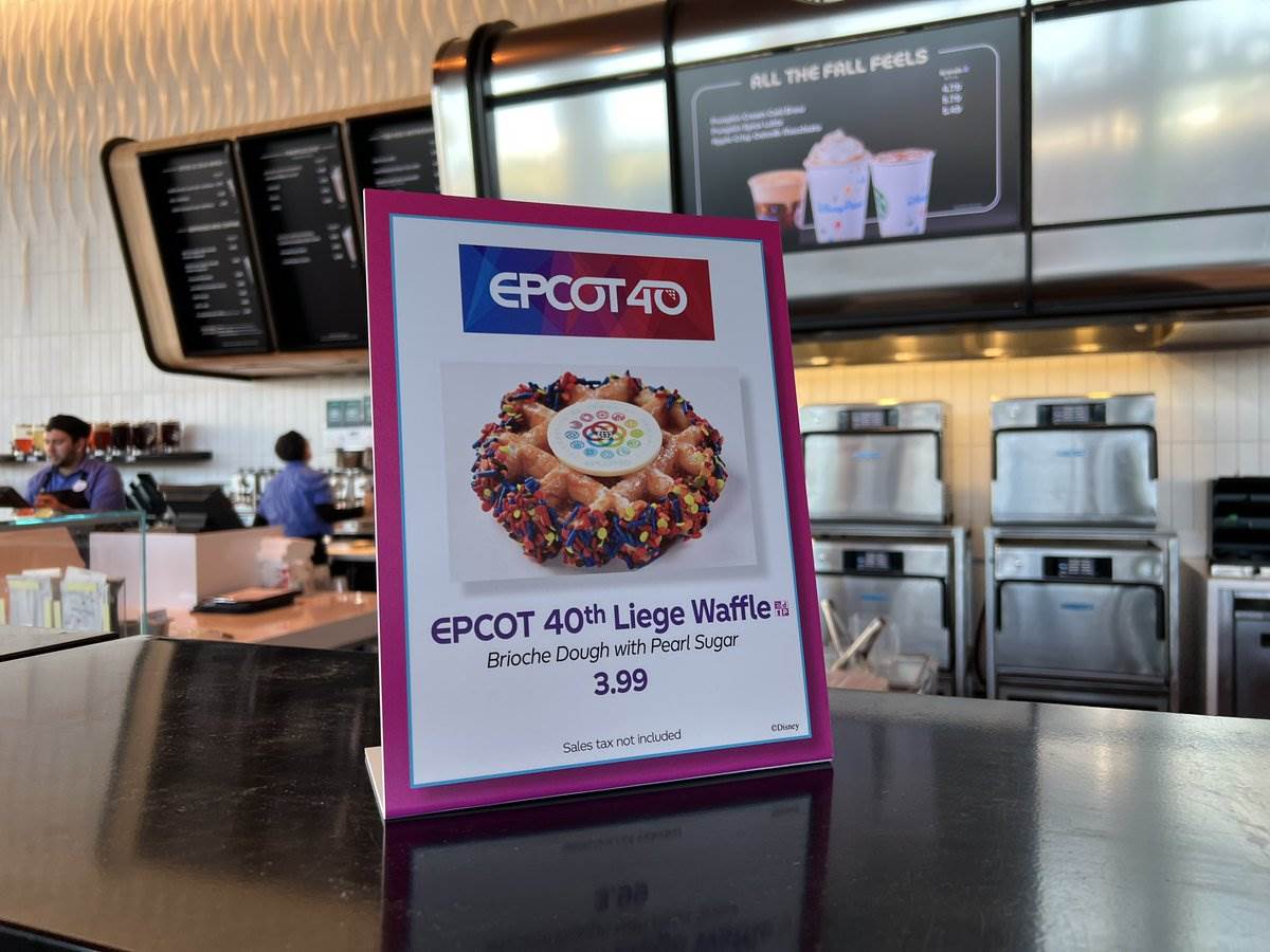 - Across the park, special food and beverage items are available for the anniversary weekend, including an EPCOT 40th Liege Waffle at Connections Café and a Figment Sponge Cake at Sunshine Seasons.