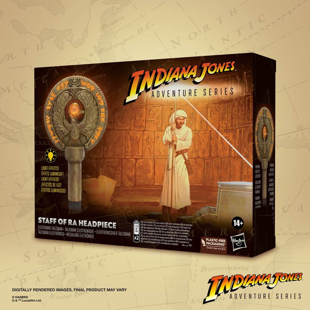 Lastly, one life-size roleplay Indiana Jones item was revealed for the Adventure series: the Headpiece to the Staff of Ra, which Disney Parks also released this year in realistic metal form. This Hasbro version will be plastic, includes light-up text around the edge of the headpiece, part of the Staff of Ra itself, and a base that replicates part of the Map Room floor.