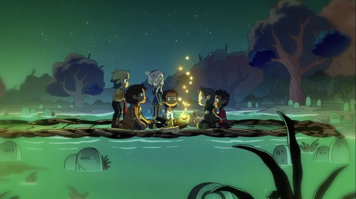She and V run out the door to find Luz. Throughout the Halloween festival, something is calling to Hunter, and he goes to investigate. Finally, Hunter spills the beans to get Luz to help him. They have a way to find titan’s blood, and it’s going to be a surprise, but he needs to find it first. Luz, being the helpful friend, helps. BUT. Something is amuck. Hunter’s voice is changing, his eyes are turning different colors, and he’s just not himself. Alas, they go deep into the woods when Luz discovers that because the titan blood is nearby, her glyph magic is working again. They head deeper into the forest and find a sunken graveyard with an island in the middle of it.