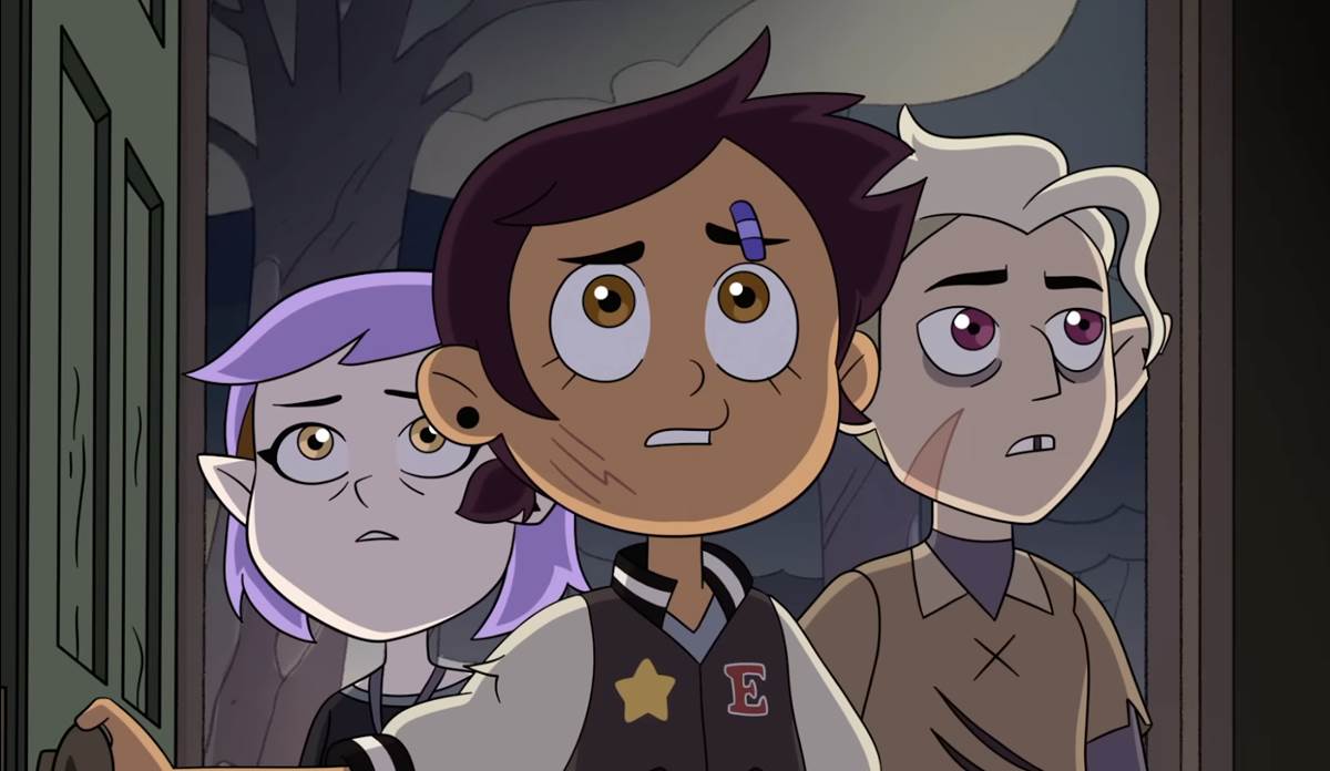 We catch a glimpse of what we saw at the end of season 2, when King blasted Luz and her friends back through the collapsing portal and into the demon realm. It’s essentially a replay of that last 90 seconds when Luz, Amity, Gus, Willow, and Hunter show up at Luz’s human world doorstep. Complete with Amphibia easter egg again.