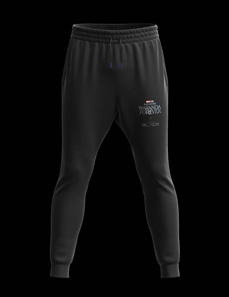 - The collection features athleisure styles for both men and women, including performance shirts, tights, hoodies, and joggers in black, purple and gray, emblazoned with official Black Panther artwork. Sizes range from XS-4XL.