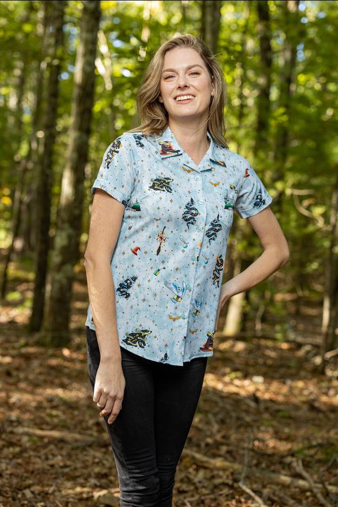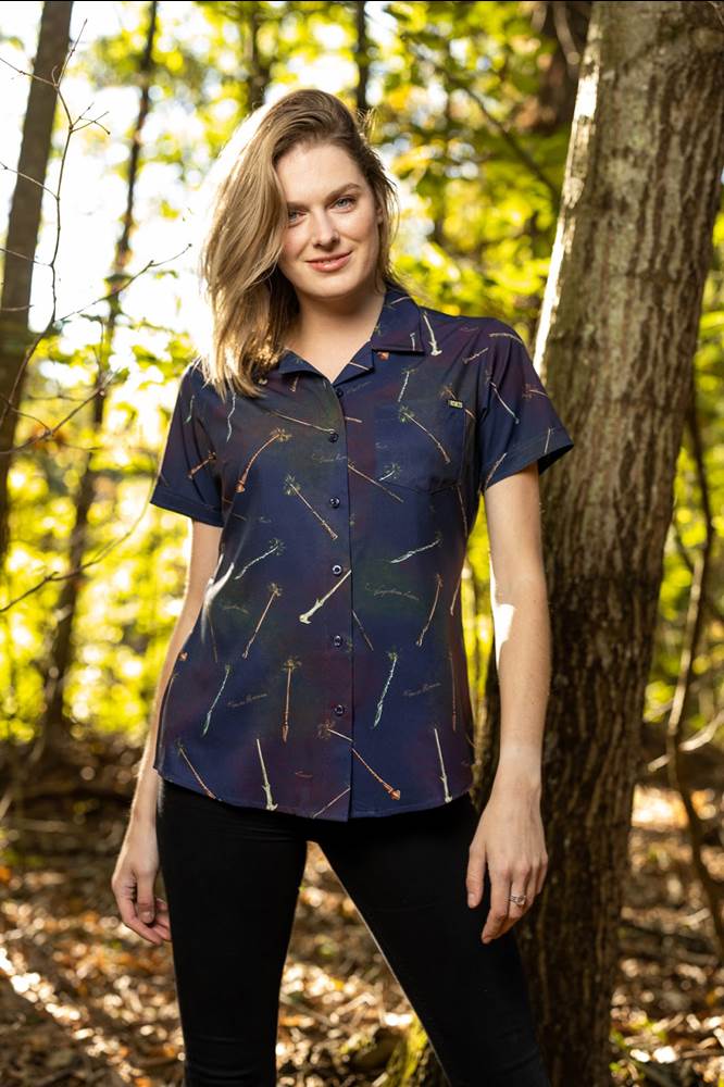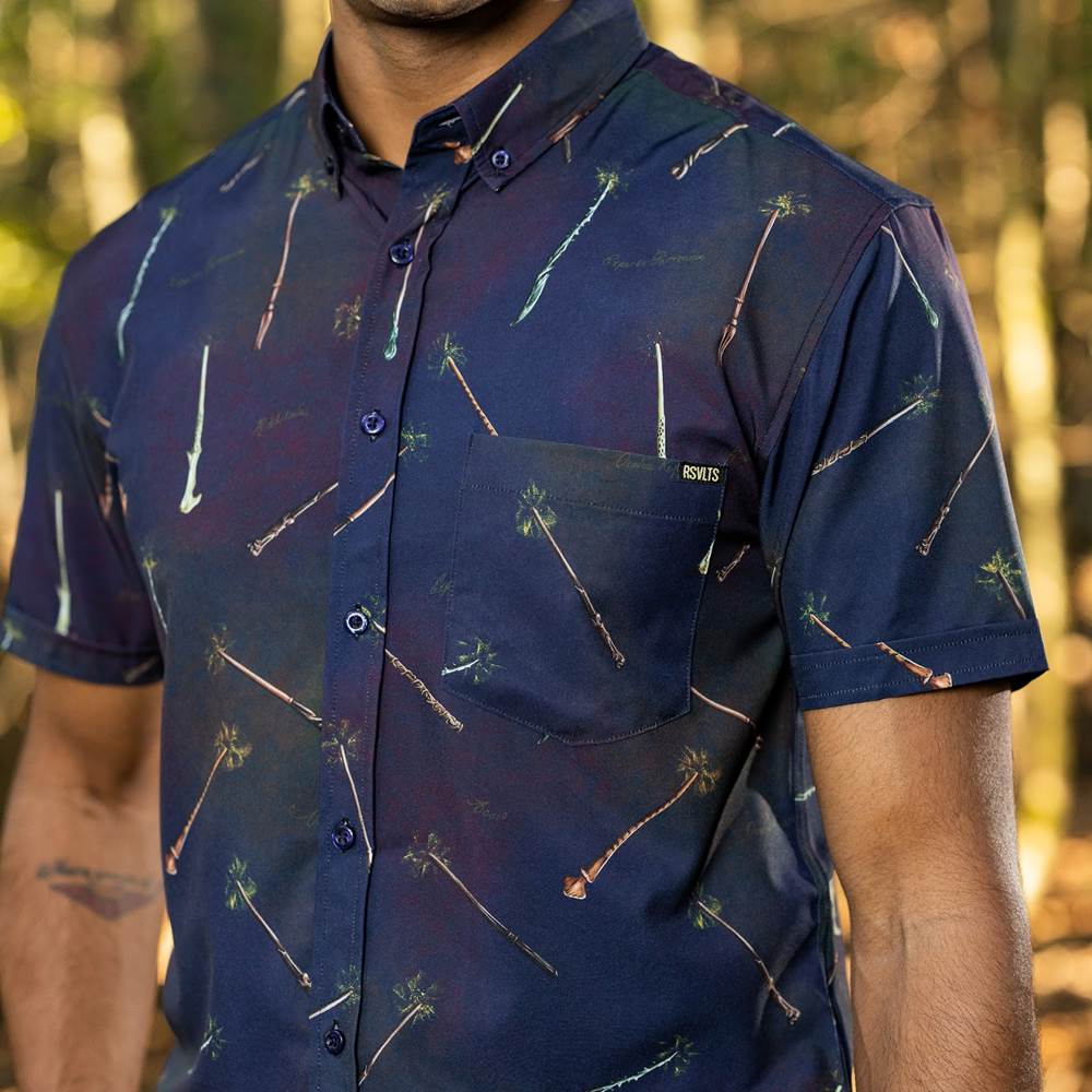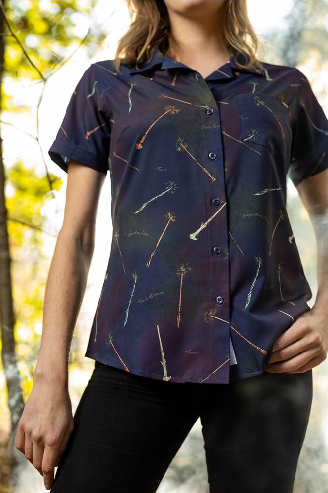 The wand chooses the wizard. And this shirt has chosen you….This button down contains some of Ollivander’s finest work for the likes of Harry Potter, Hermione Granger, Luna Lovegood, Neville Longbottom, Draco Malfoy, Nymphadora Tonks, and He-Who-Must-Not-Be-Named. We even threw a Death Eater wand in there because, well, they’re super cool looking. And if you gander closely, you might just find a few special words spelled out throughout the design."
