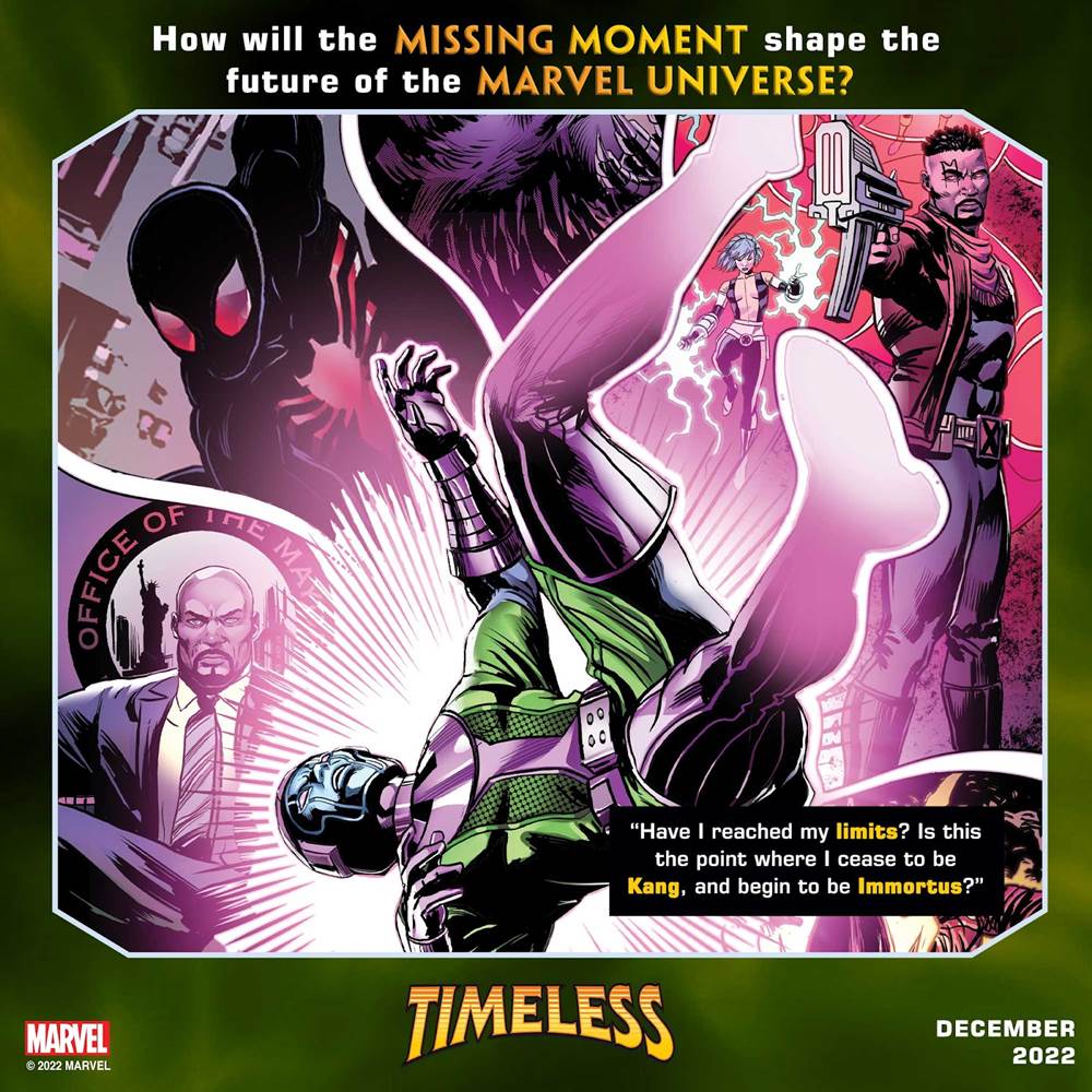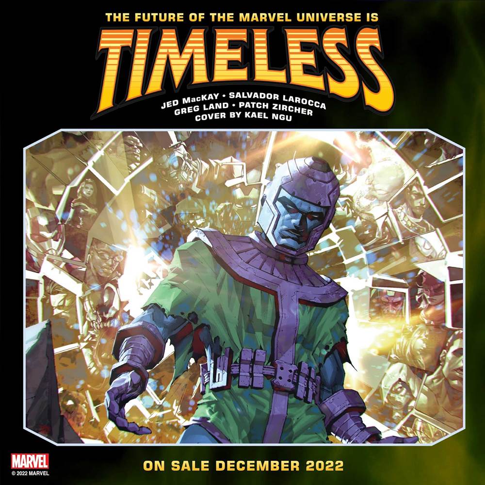 - Writer Jed MacKay: "Kang is back on another adventure – but could this be his last one? Once again, we step into the Conqueror's thigh-high boots to go stamping through the future. But this time Kang is in an unfamiliar position: fleeing. ‘Timeless’ 2022 is bigger and better than ever before. More previews of what the Marvel Universe has in store, more action, and a story that sets up the dominoes for a huge story coming in the future that I'm really excited to see play out!"